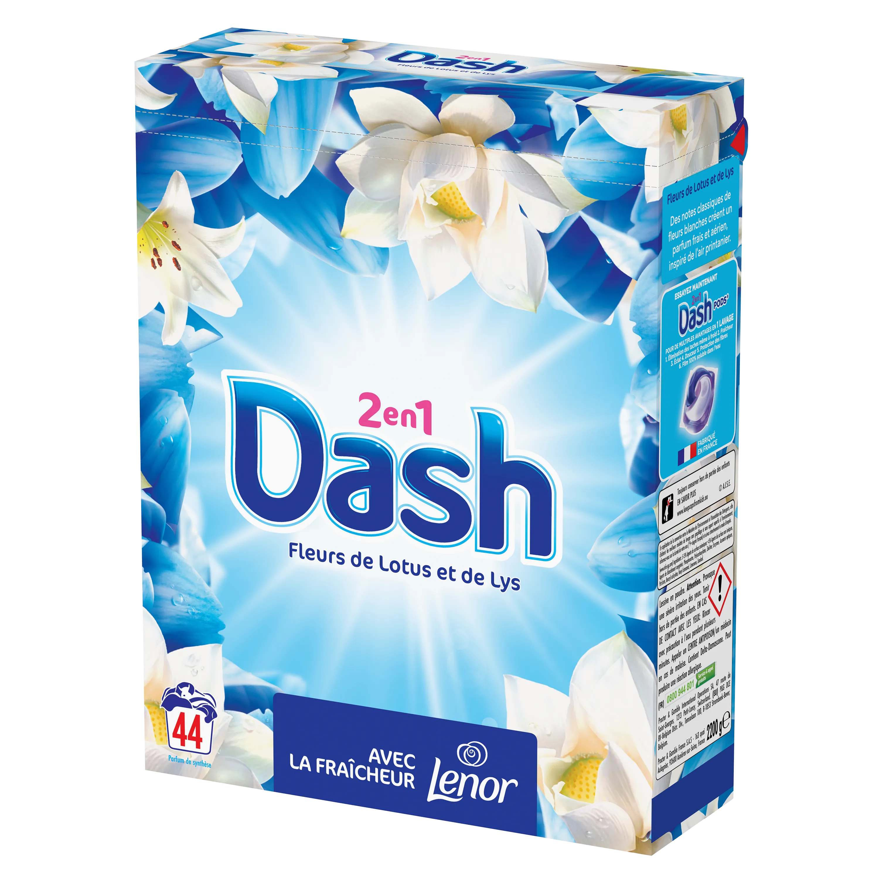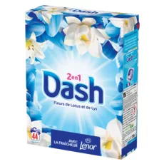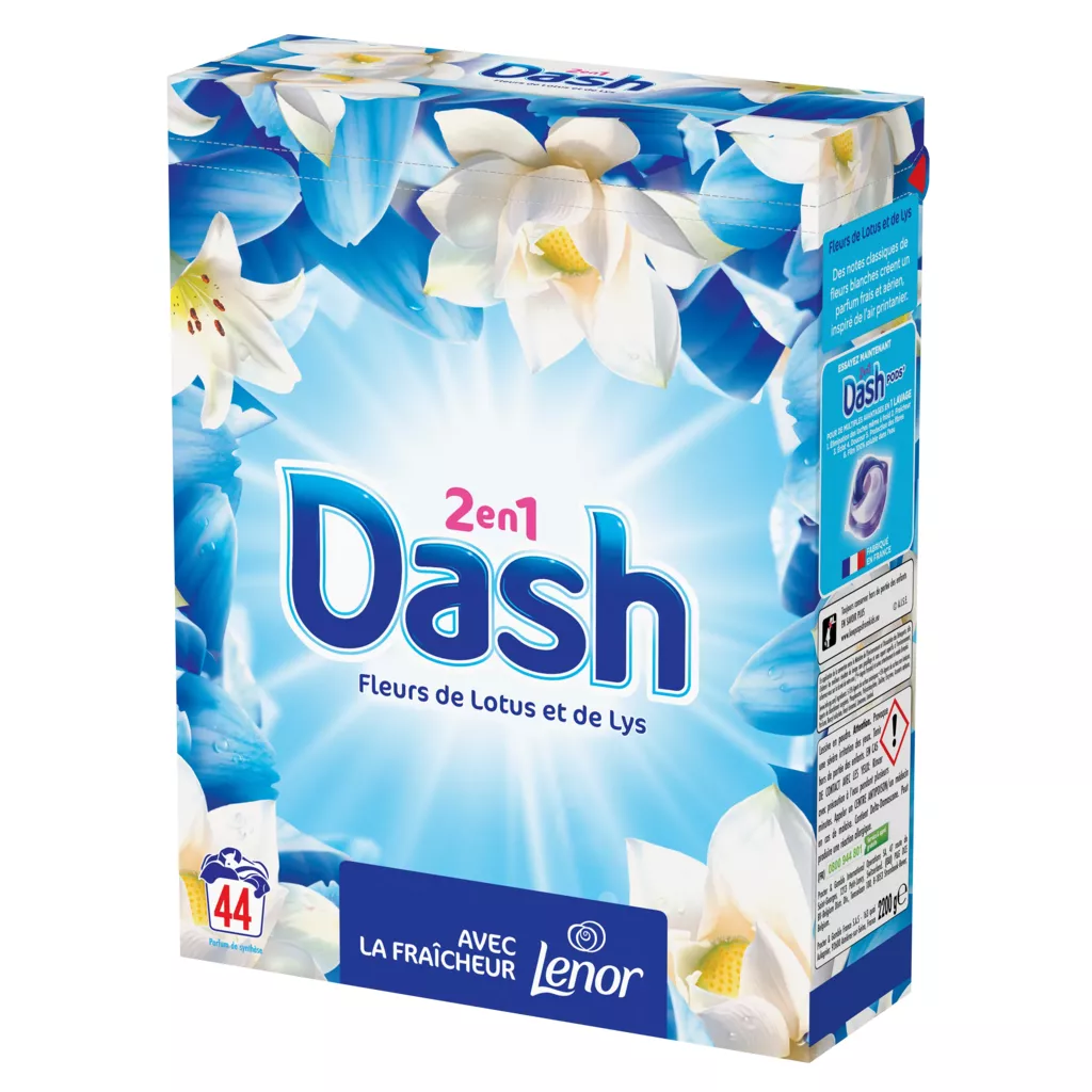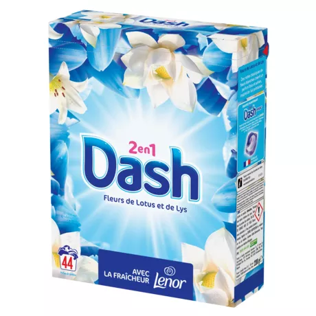 La lessive en poudre Dash 2in1 allie la propreté éclatante à la fraîcheur de Lenor. Vous pourrez ainsi profiter de vêtements incroyablement frais du matin au soir. Lys blancs et fleurs de lotus associés à des senteurs riches d'ambre et de bois de santal, le tout équilibré par des notes vivifiantes de melon, pour une fraîcheur exaltante. Dash 2en1 Fleur de Lotus et Lys est également disponible en capsules PODS et en lessive liquide.