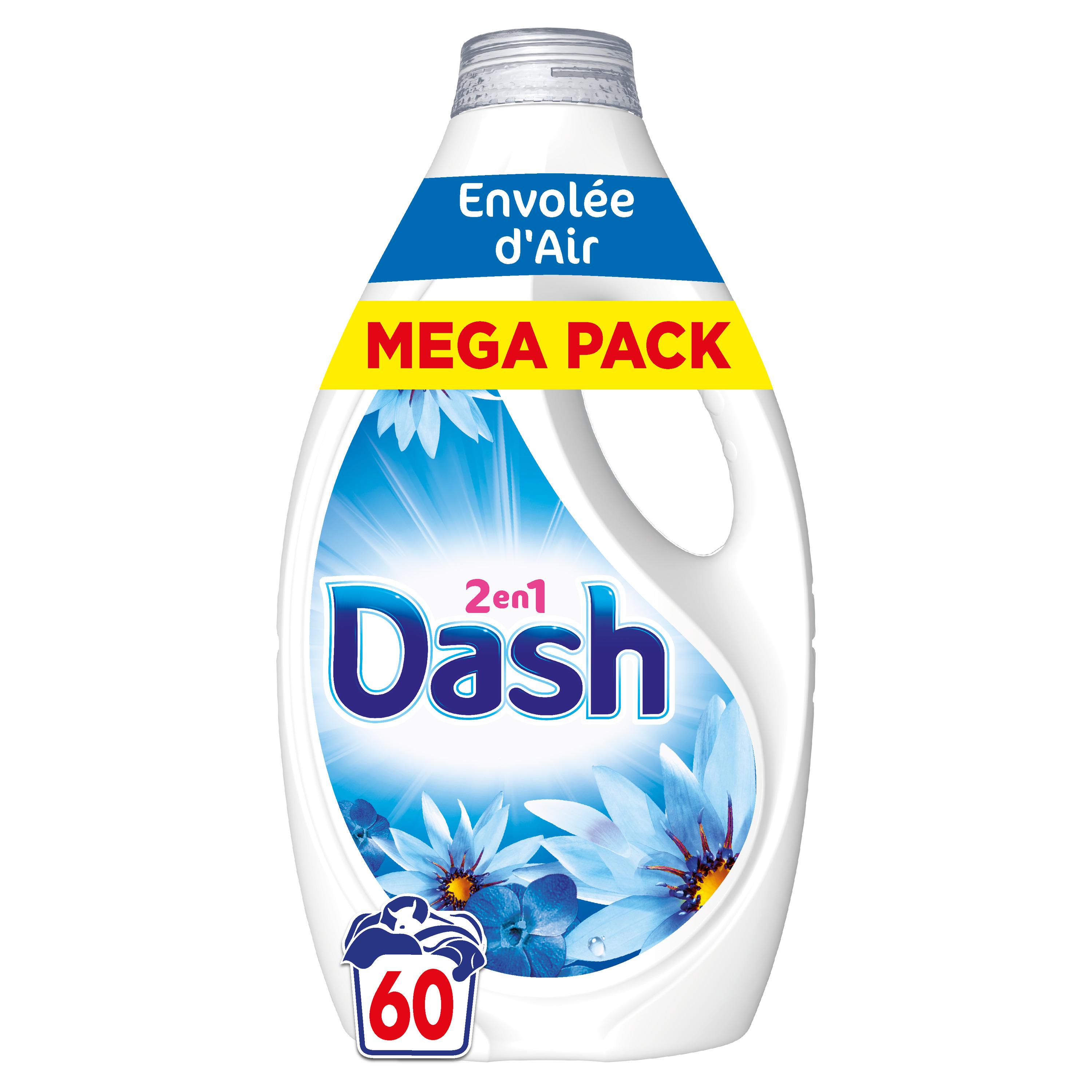 Découvrez la lessive liquide Dash 2en1 Envolée d'Air avec jusqu'à 3 SEMAINES DE FRAÎCHEUR* (*jusqu'à, dans l'armoire) et Lenor . La lessive liquide Dash 2en1 nettoie vos vêtements en profondeur, les laissant frais et doux ! Des fleurs fraîches se mêlent harmonieusement à des accords marins pour éveiller vos sens avec un parfum qui évoque la brise marine. Pour de meilleurs résultats, mettez le bouchon de dosage contenant la lessive dans le tambour de la machine. En plus, Dash 2en1 est un produit fabriqué en France avec plus de 50 ans d'expérience ! Dash 2in1