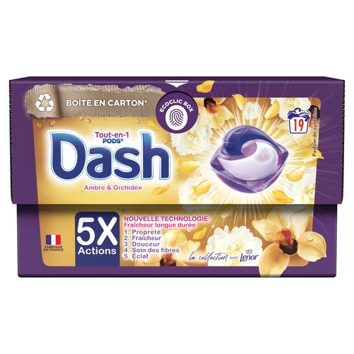Essayez la lessive en capsules Dash Tout-en-1 PODS Ambre et Orchidée pour une propreté éclatante et un linge d’une fraîcheur exceptionnelle, même en lavage à froid. Une fraîcheur de maniaque. La lessive Dash est dotée d’une technologie fraîcheur innovante qui assure une fraîcheur longue durée en laissant un parfum inspiré des senteurs du printemps. La lessive Dash PODS est désormais proposée dans une boîte en carton recyclable fabriquée à partir de 70 % de fibres recyclées. Réduisons notre consommation de plastique. En prime, la lessive Dash traite votre linge avec ses 5 ACTIONS : 1. Nettoyage 2. Fraîcheur 3. Douceur 4. Soin des fibres 5. Propreté éclatante. Dash est un produit fabriqué en France et la marque a plus de 50 ans d’expérience. Astuce. Pour un plaisir d’utilisation optimal, utilisez les capsules Dash Tout-en-1 PODS avec l’adoucissant Lenor et le parfum de linge Lenor pour un nettoyage en profondeur accompagné d’une sensation de fraîcheur et de douceur.