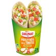 Galette de blé aux graines de lin garnie de viande de poulet rôti traitée en salaison, de sauce au fromage blanc, de tomates et de fromage