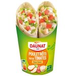 Ingrédients : Galette de BLÉ aux graines de lin 48% (farine de BLÉ 29.5%, eau, huile de colza, graines de lin 1.1%, sel, poudre à lever : carbonates de sodium), viande de poulet rôti traitée en salaison préparée en France 16% (viande de poulet origine UE, eau, acidifiants : lactate de potassium - acétates de potassium, dextrose, amidon de pomme de terre et amidon transformé de pomme de terre, sel, stabilisants : triphosphates, sucre roux, antioxydant : érythorbate de sodium), sauce au FROMAGE blanc 12% [ FROMAGE blanc 4.1%, huile de colza, eau, vinaigre d’alcool, amidon, jaune d ’OEUF, MOUTARDE (eau, graines de MOUTARDE, vinaigre d’alcool, sel), sucre, sel, arôme (dont POISSON), épaississant : gomme guar], salade 8%, tomate 5%, FROMAGE pasteurisé au LAIT de vache 4% (LAIT de vache, sel, coagulant microbien), tomates mi-séchées assaisonnées 2%. (tomates semi-déshydratées 1.8%, huile de colza, sel, origan, ail), amidon transformé de pomme de terre ( % exprimés sur le produit fini). Informations en MAJUSCULES destinées aux personnes allergiques. Traces éventuelles de crustacés, céleri, graines de sésame, fruits à coque, soja et lupin