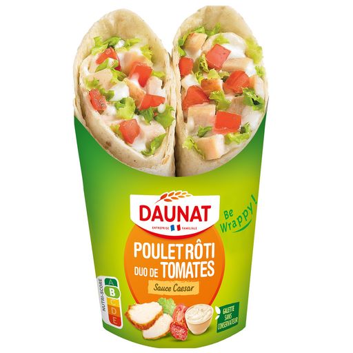 Be Wrappy: des ingrédients travaillés avec du poulet sublimé par sa sauce caesar, le tout dans une galette au lin, pour varier votre pause plaisir.