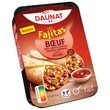 Découvrez les Fajitas Daunat pour un moment de gourmandise et de convivialité avec ses recettes aux saveurs d'Amérique Latine : une galette fondante et moelleuse renfermant une garniture gourmande : du bœuf Origine France, des petits légumes cuisinés, du maïs et des haricots rouges. L’ensemble légèrement relevé d’une sauce Salsa signée Daunat. Pour un résultat moelleux et croustillant, à réchauffer à la poêle. Pour 1 à 2 personnes.