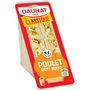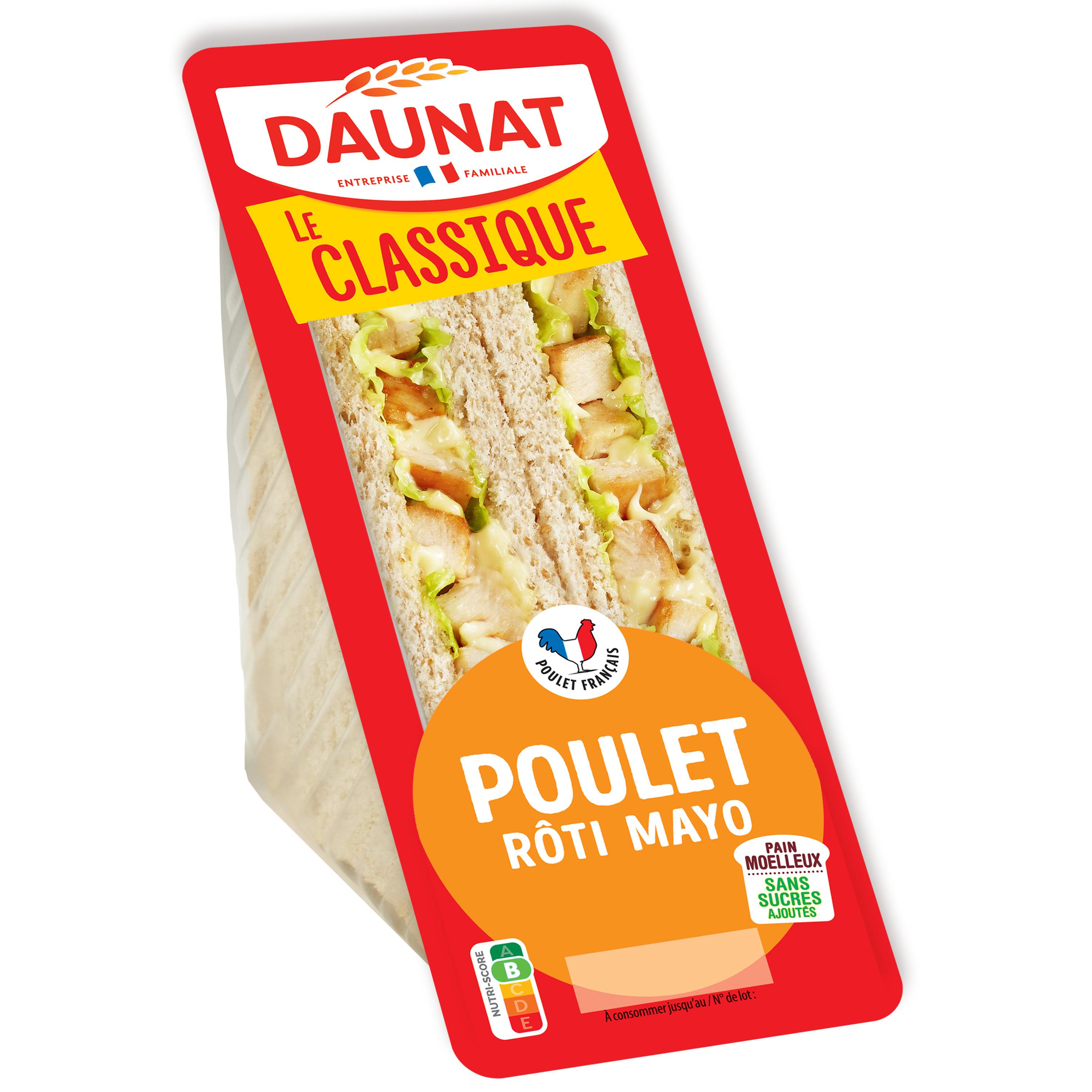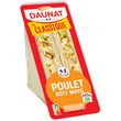 Ingrédients : Pain de mie à la farine complète 50% (farine de BLÉ, farine complète de BLÉ 15%, eau, huile de colza, sucre, sel, levure, GLUTEN de blé), viande de poulet rôti traitée en salaison préparée en France 28% (viande de poulet origine UE, eau, acidifiants : lactate de potassium - acétate de potassium, dextrose, amidon de pomme de terre et amidon transformé de pomme de terre, sel, stabilisant : triphosphates, sucre roux, antioxydant : érythorbate de sodium), mayonnaise 16% [huile de colza, eau, jaune d’ŒUF, MOUTARDE de Dijon (eau, graines de MOUTARDE, vinaigre d’alcool, sel), vinaigre d’alcool, sel], salade. (% exprimés sur le produit fini)