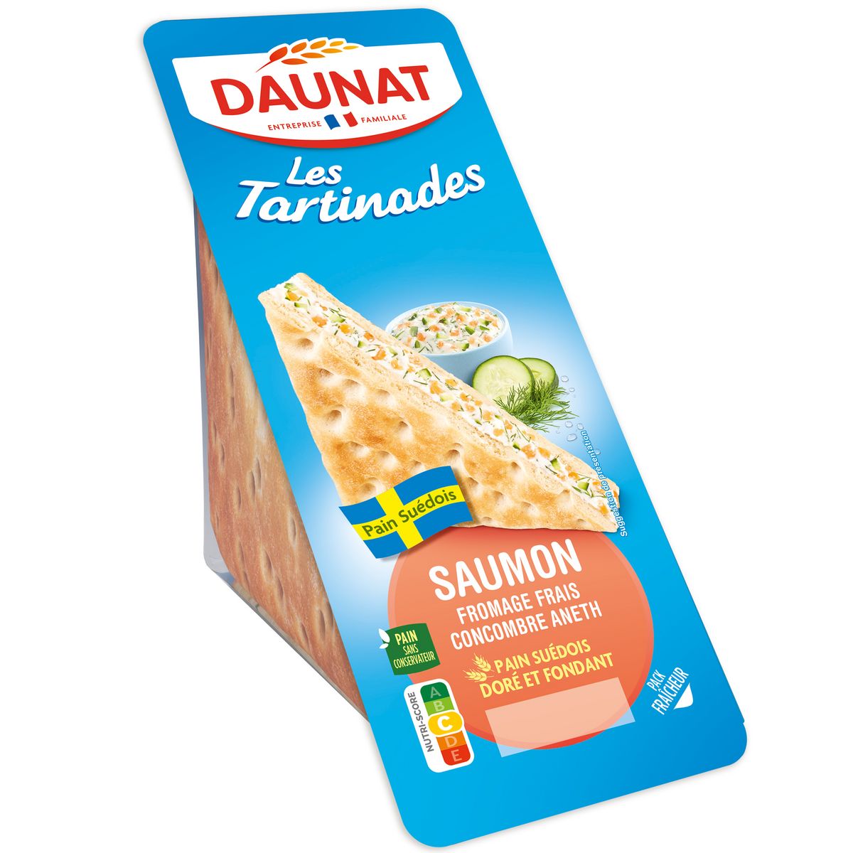 Ingrédients : Pain suédois 52% (farine de BLÉ, eau, sucre, farine de SEIGLE, levure, GLUTEN de blé, huile de colza, sel, farine d’ORGE maltée torréfiée), FROMAGE frais nature 12% (FROMAGE frais, sel), sauce au FROMAGE blanc [FROMAGE blanc 3.9%, huile de colza, eau, vinaigre d’alcool, amidon, jaune d’ ŒUF, MOUTARDE de Dijon (eau, graines de MOUTARDE, vinaigre d’alcool, sel), sucre, sel, épaississant : gomme guar], SAUMON 12% [SAUMON cuit (SAUMON Salmo salar, sel), SAUMON Atlantique fumé (SAUMON Atlantique Salmo salar 4.3%, sel)], concombre 11%, aneth 0.2%. (% exprimés sur le produit fini)