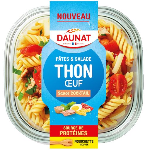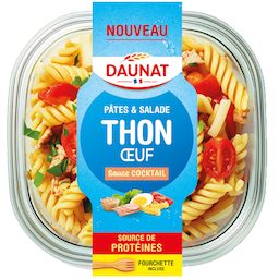la nouvelle gamme de salades équilibrées et gourmandes de Daunat : source de protéines, elles proposent une variété d’ingrédients savoureux et de qualité, le tout à un prix accessible. Découvrez la recette Thon oeuf composée de morceaux de filets de thon, d'un demi oeuf et d'un mélange de pâtes cuisinées, salade verte et de crudités fraîches et croquantes. Le tout relevé par une sauce Cocktail pour un plaisir garanti!