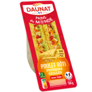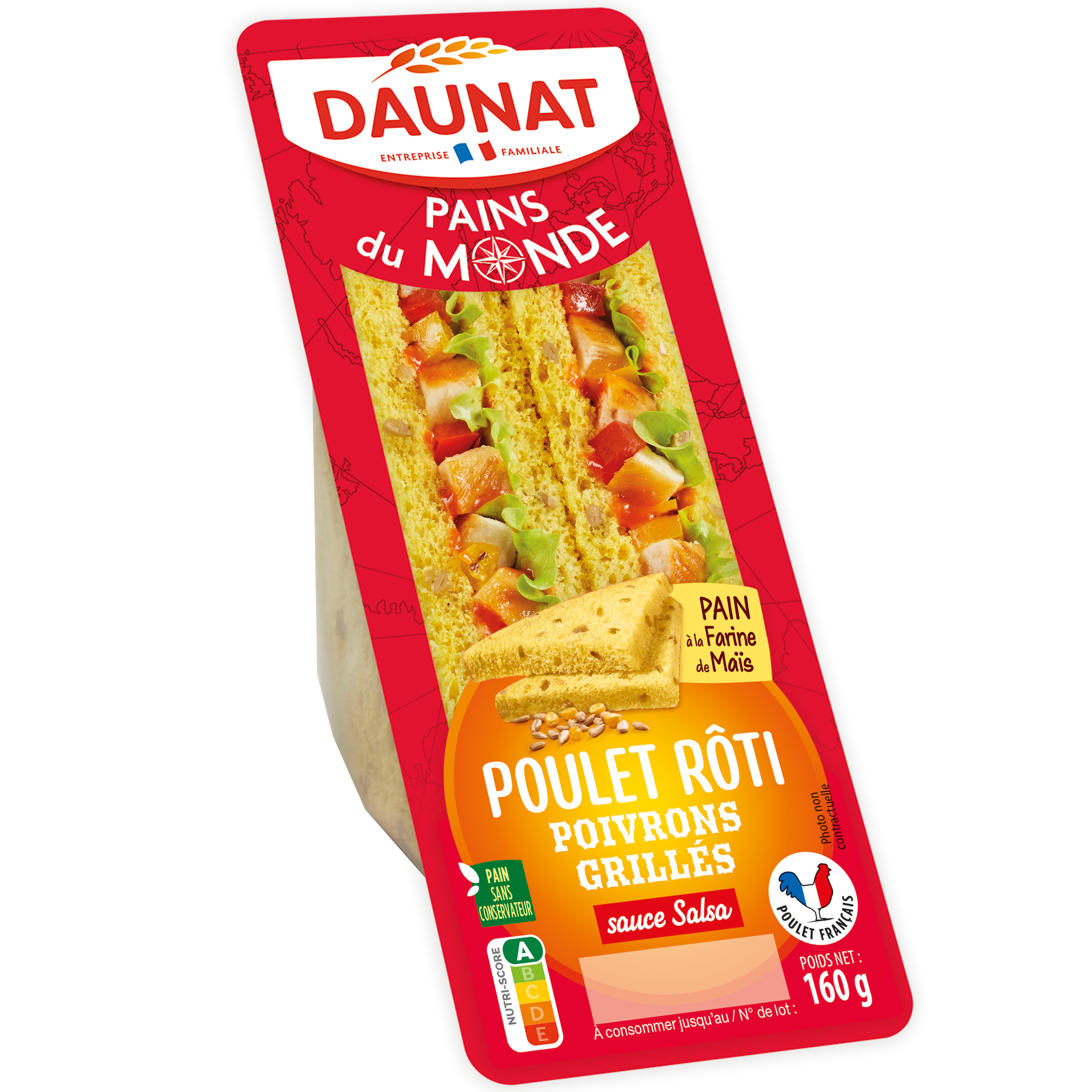 Ingrédients : Pain de mie à la farine de maïs 50% (farine de BLE 24%, eau, graines de tournesol décortiquées 4.1%, farine de MAÏS 3.7%, farine de maïs toasté 2%, GLUTEN de blé, levure, huile de colza, sel, vinaigre d’alcool, extrait végétal à pouvoir colorant : curcuma, antioxydant : extrait d’acérola), viande de poulet rôti traitée en salaison préparée en France 18% (viande de poulet origine France, eau, acidifiants : lactate de potassium - acétates de potassium, dextrose, amidon de pomme de terre et amidon transformé de pomme de terre, sel, stabilisant : triphosphates, sucre roux, antioxydant : érythorbate de sodium), sauce salsa 13% [eau, pulpe de tomate au jus (tomates, jus de tomates), oignons, purée de tomate, vinaigre d’alcool, huile de COLZA, purée de poivron rouge, AMIDON, sucre, épices, sel, poudre de tomate, jus de citron concentré, épaississant : gomme guar], poivrons grillés 6% (poivrons rouges et jaunes grillés, jus de citron concentré), tomate, salade. (% exprimés sur le produit fini)