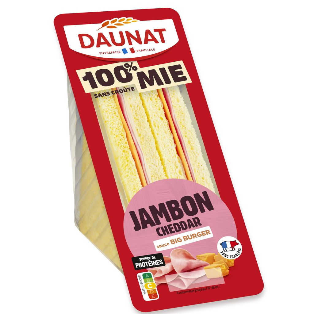 Un sandwich élaboré avec un pain 100% mie sans croûte sans conservateur à la texture ultra moelleuse et au goût légèrement sucré. Il est garni d'une tranche de jambon élaboré avec du porc origine France, d'une tranche de cheddar et d'une sauce savoureuse sans conservateur.