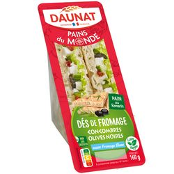 Sandwich pain au romain dés de fromage concombres olives noires
