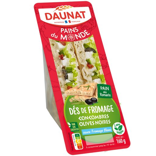 SANDWICH AU PAIN AU ROMARIN GARNI DE FROMAGE AU LAIT DE VACHE PASTEURISE, D’UNE SAUCE AU FROMAGE BLANC, DE CONCOMBRE, D’OLIVE NOIRE ET DE TOMATES MI-SECHEES ASSAISONNEES.