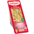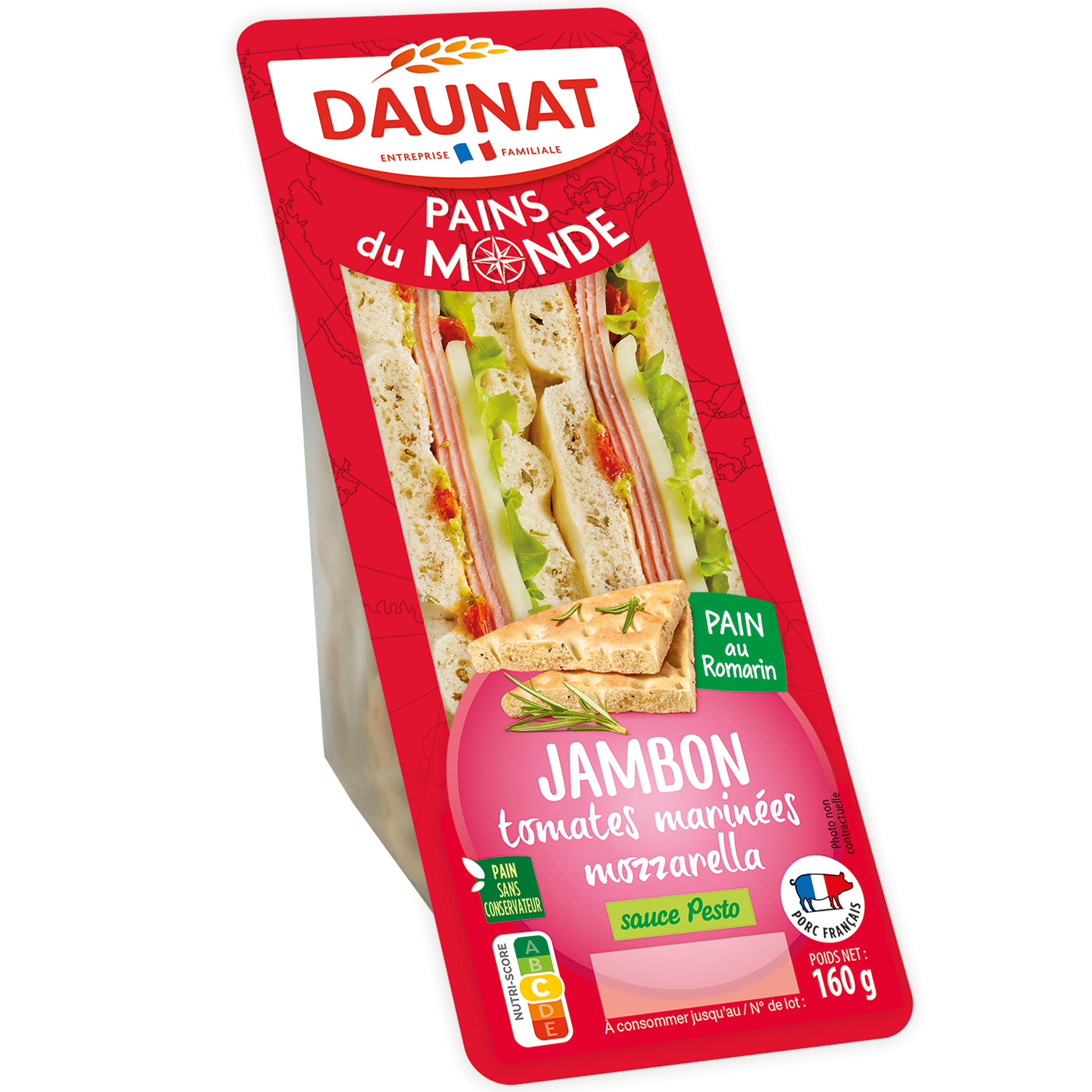 Ingrédients : Pain au romarin 50% (farine de BLE, eau, sucre, levure, huile de colza, sel, GLUTEN de blé, romarin 0.45%), jambon cuit standard 16% (jambon de porc origine France, eau, sel, dextrose, sirop de glucose, arômes naturels, stabilisants : triphosphates – diphosphates, antioxydant : érythorbate de sodium, conservateur : nitrite de sodium), sauce au YAHOURT au pesto 13% [huile de colza, eau, YAHOURT 2.7%, vinaigre d’alcool, basilic 0.4%, amidon, jaune d’OEUF, MOUTARDE de Dijon (eau, graines de MOUTARDE, vinaigre d’alcool, sel), sucre, huile d’olive vierge 0.2%, sel, jus de citron concentré, PARMESAN 0.06%, épaississant : gomme guar, ail 0.01%, épice], MOZZARELLA 8% (LAIT de vache pasteurisé, sel, ferments lactiques, coagulant), tomates mi-séchées assaisonnées 6% (tomates semi-déshydratées 5.8%, huile de colza, sel, origan, ail), salade. (% exprimés sur le produit fini)