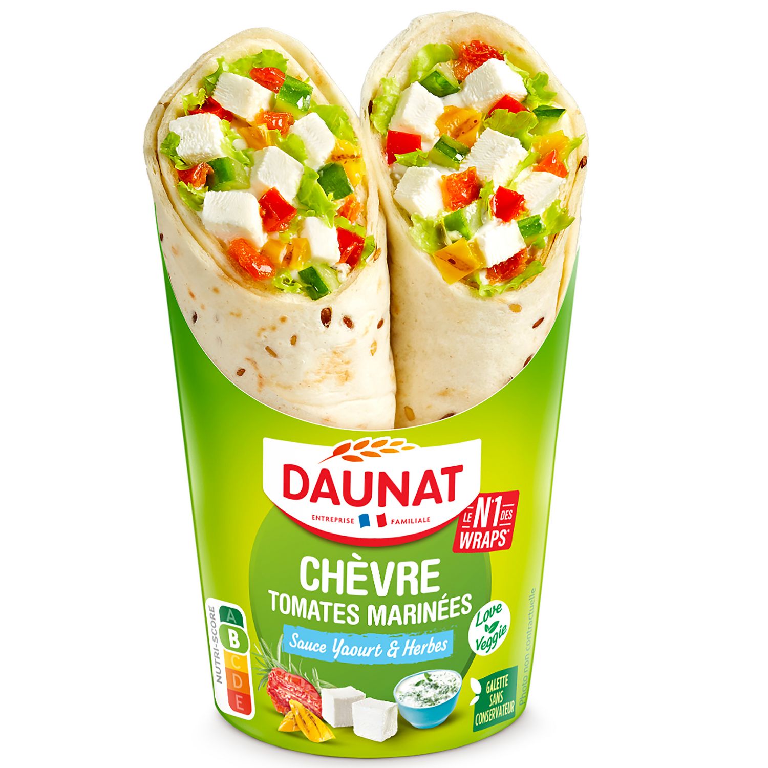 Ingrédients : Galette de BLÉ aux graines de lin 48% (farine de BLÉ 29.5%, eau, huile de colza, graines de lin 1.1%, sel, poudre à lever : carbonates de sodium), sauce au YAOURT et aux herbes de provence 13% (huile de colza, eau, YAOURT 2,6%, vinaigre d'alcool, amidon, sucre, jaune d'OEUF, herbes de provence 0,1%, sel, épaississant : gomme guar), FROMAGE au LAIT de chèvre fabriqué en France 9% (LAIT de chèvre pasteurisé, sel, ferments lactiques et fongiques, coagulant), salade 8%, tomates mi-séchées assaisonnées 7% (tomates semi-déshydratées 6.5%, huile de colza, sel, origan, ail), concombre, poivrons grillés 4% (poivrons grillés, jus de citron concentré), amidon transformé de pomme de terre. ( % exprimés sur le produit fini). Informations en MAJUSCULES destinées aux personnes allergiques. Traces éventuelles de moutarde, poissons, crustacés, céleri, graines de sésame, fruits à coque, soja et lupin