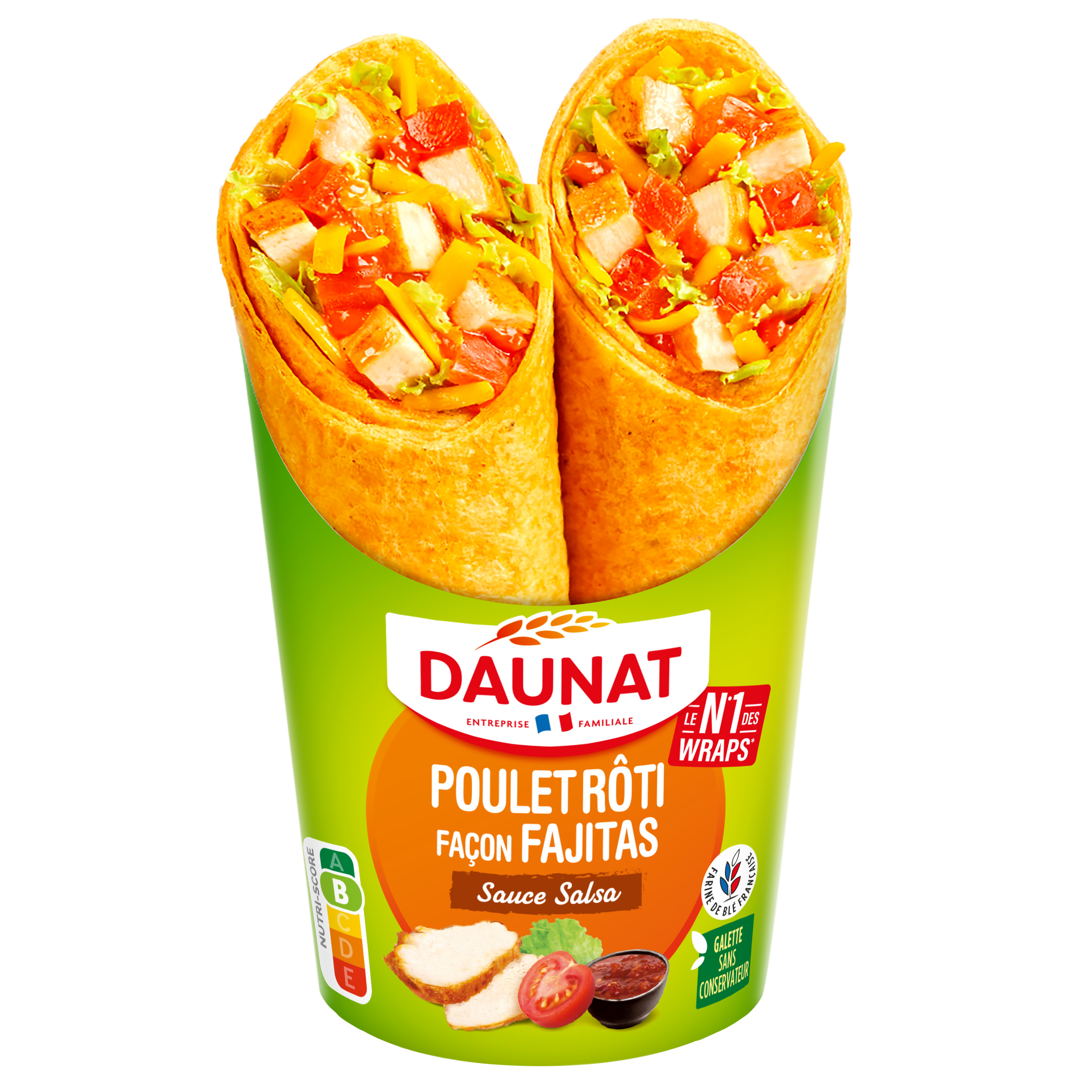 Ingrédients : Galette de BLÉ à la tomate 48% (farine de BLÉ 30%, eau, huile de colza, sel, poudre de tomate 0.4%, paprika, poudre à lever : carbonate de sodium, basilic), sauce salsa 13% [eau, pulpe de tomate (tomates, jus de tomates, acidifiant : acide citrique), oignons, purée de tomate, vinaigre d'alcool, huile de colza, purée de poivron rouge, amidon, sucre, épices, sel, poudre de tomate, jus de citron concentré, épaississant : gomme guar], viande de poulet rôti traitée en salaison préparé en France 17% (viande de poulet origine UE, eau, acidifiants : lactate de potassium - acétates de potassium, dextrose, amidon de pomme de terre et amidon transformé de pomme de terre, sel, stabilisants : triphosphates, sucre roux, antioxydant : érythorbate de sodium), salade 8%, CHEDDAR fondu (CHEDDAR, FROMAGES, eau, amidons transformés, PROTÉINES DE LAIT, LAIT ÉCRÉMÉ en poudre, BEURRE, sel de fonte : citrates de sodium, gélifiant : carraghénanes, colorant : bixine de rocou), tomate 5%, amidon transformé de pomme de terre. ( % exprimés sur le produit fini). Informations en MAJUSCULES destinées aux personnes allergiques. Traces éventuelles de moutarde, poissons, crustacés, céleri, graines de sésame, fruits à coque, soja et lupin