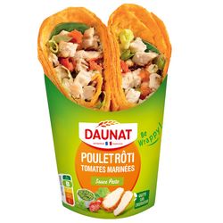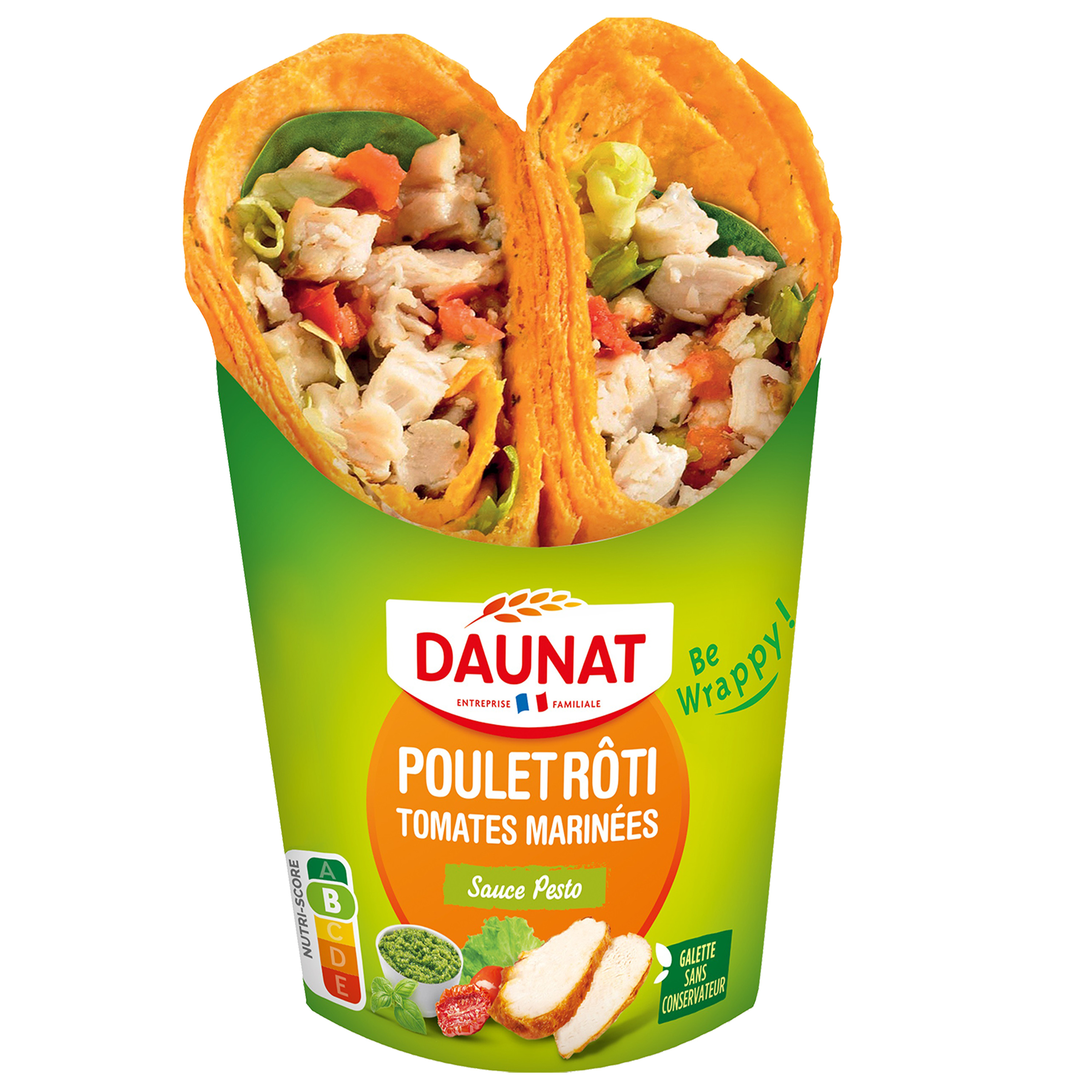 Be Wrappy: des ingrédients travaillés avec du poulet rôti, des tomates marinées associés à une sauce pesto unique, le tout dans une galette à la tomate, pour varier votre pause plaisir.