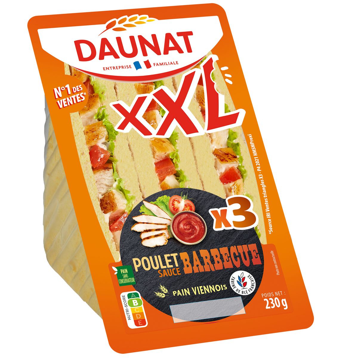 Ingrédients : Pain spécial viennois 52% (farine de BLE, eau, sucre, huile de colza, levure,sel, vinaigre d’alcool, GLUTEN de blé, extrait végétal à pouvoir colorant: extrait de carotte), blanc de poulet cuit choix traité en salaison 20% (viande de poulet origine UE, eau, sel,dextrose, gélifiant : carraghénanes, stabilisants : diphosphates - triphosphates,arôme, conservateur : nitrite de sodium), sauce barbecue 14% (eau, concentré de tomates, sucre, vinaigre d'alcool, arôme et arômes de fumée, amidon, sel, colorant : caramel, épaississant : gomme guar), tomate 9%, salade 5%. (% exprimés sur le produit fini).