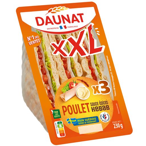 Ingrédients : Pain spécial suédois 46% (farine de BLÉ, eau, sucre, farine de SEIGLE, levure, GLUTEN de blé, huile de colza, sel, farine d’ORGE maltée torréfiée), blanc de poulet cuit traité en salaison qualité choix 25% (viande de poulet origine UE 21.2%, eau, sel, dextrose, gélifiants : carraghénane, stabilisants : diphosphates - triphosphate de sodium, arôme, conservateur : nitrite de sodium), sauce condimentaire au mix d'épices kebab 13% [eau, huile de colza, mix épices kebab 0.9% ( épices et plantes aromatiques, tomate), MOUTARDE de Dijon (eau, graines de MOUTARDE, vinaigre d'alcool, sel), amidon, jaune d' ŒUF, vinaigre d'alcool, sucre, sel, épaississant : gomme guar], tomate 10%, salade 6%. (% exprimés sur le produit fini).