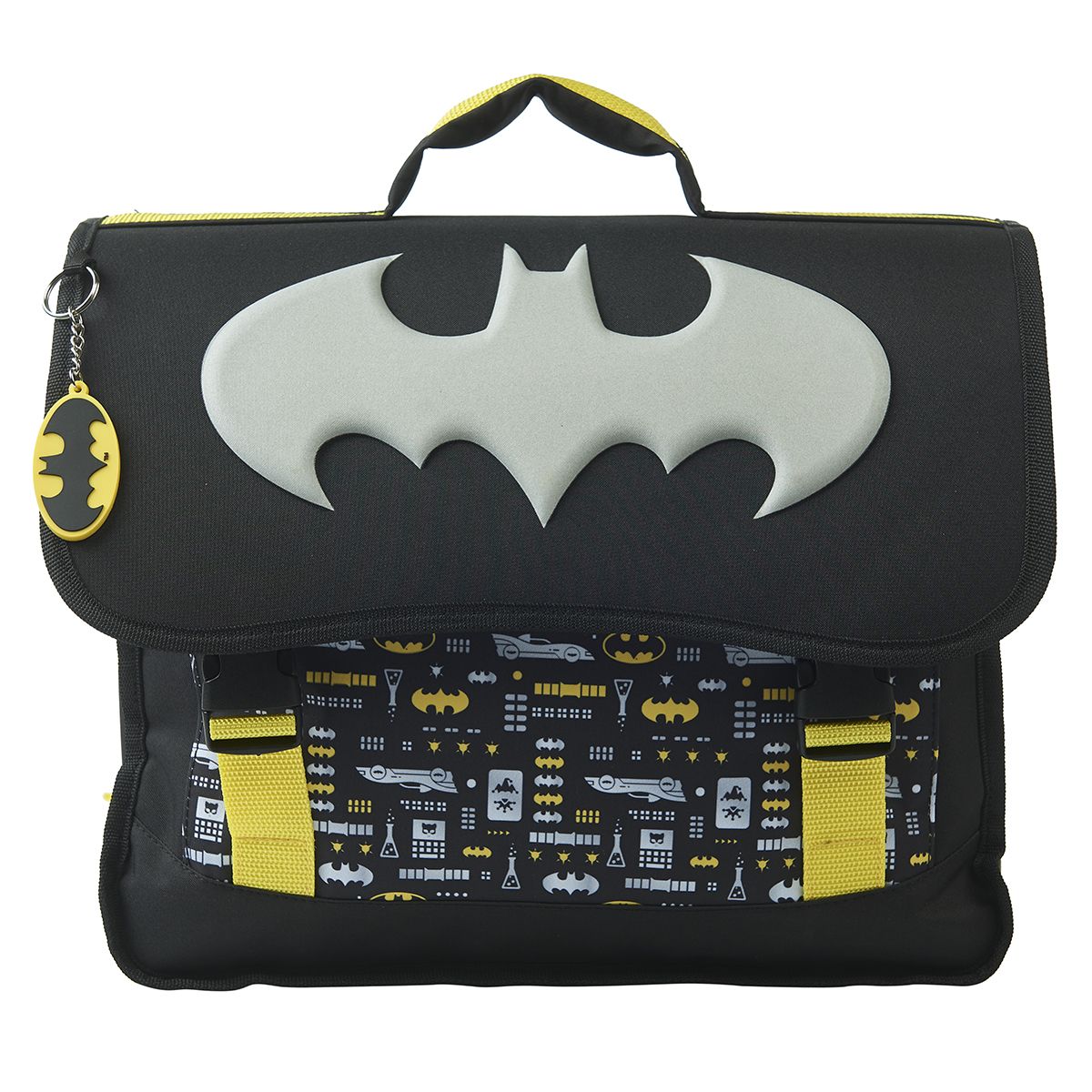 A l’intérieur, une poche zippée accueille un trousseau de clés, une carte de cantine et les petites affaires personnelles que l'on ne veut surtout pas perdre. A l'avant, une grande poche à soufflet fermée par patte auto-agrippante permet d’organiser le stockage du petit matériel scolaire : on y glisse le cahier de texte ou l'agenda, l’emploi du temps, la règle, une palette de peinture et le matériel de géométrie. Ce petit cartable Batman se ferme à l'aide d'un rabat muni de 2 attaches en plastique, pour pouvoir ouvrir et fermer son cartable sans risque de se pincer les doigts. La poignée robuste est rembourrée pour plus de confort. Confectionné dans une matière résistante, ce cartable à rabat résiste aux intempéries, à l’usure et à l’épreuve de la garderie et de la cour de récré ! Ce modèle dispose d’éléments réfléchissants sur les côtés pour rester visible en cas de faible luminosité. En polyester 300D. Poids : 650 gr. Dimensions : 31x37x16 cm. Conseil d'entretien : nettoyer les surfaces extérieures et intérieures du sac avec une lingette ou une microfibre humide. Ses atouts : ? Un design 3D avec breloque ? Grands compartiments spacieux ? Éléments réfléchissants ? En toile résistante ? Renforts au niveau des lombaires ? Poignée de transport rembourrée ? Larges bretelles ajustables matelassées