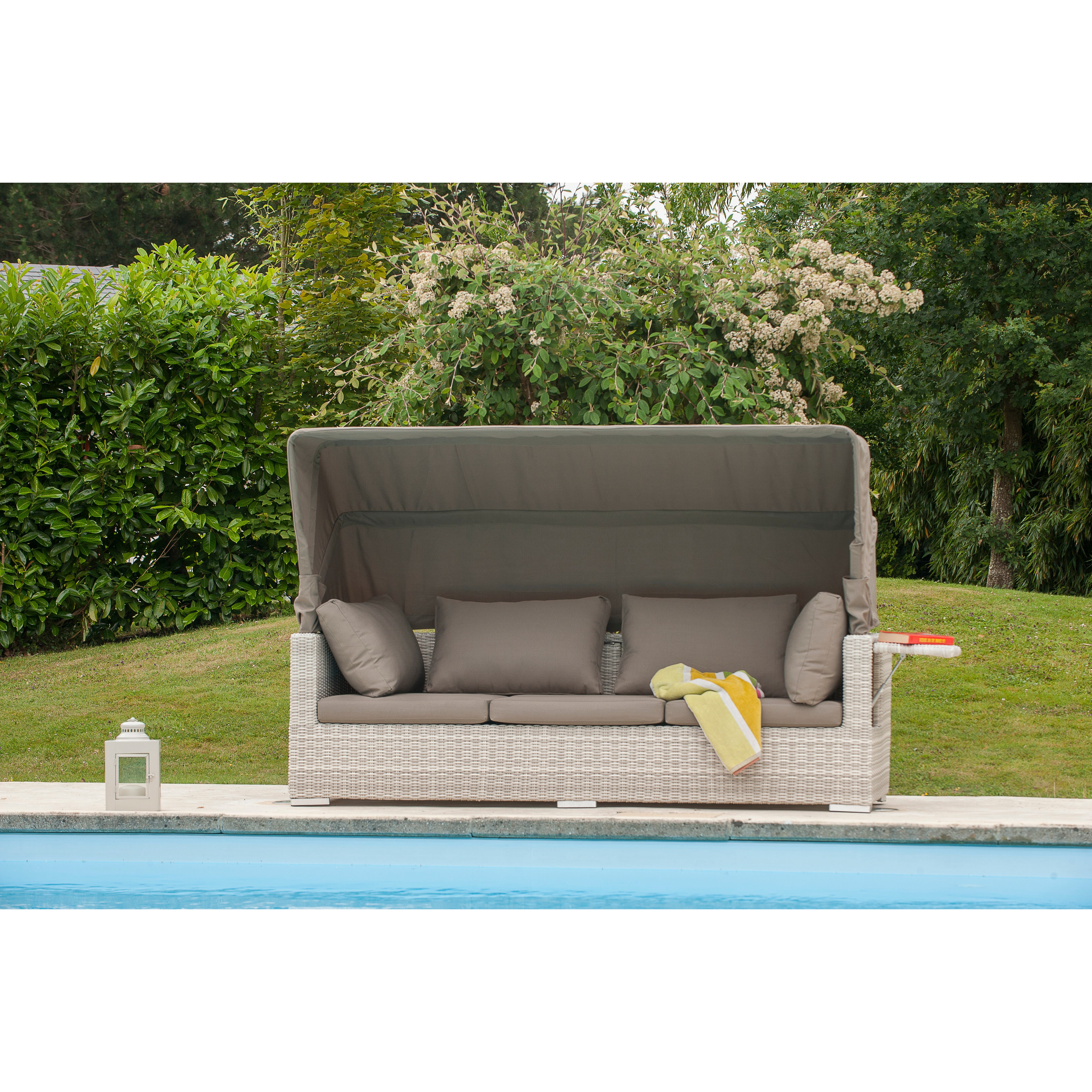 Ce canapé Seychelles 3 places va vous surprendre et surtout vous faire rêver par ses multiples atouts ! Conçu pour vous apporter confort et détente, il dispose de coussins moelleux, d'un auvent pour vous protéger du soleil et du vent, mais aussi d'une assise relevable vous permettant de vous prélasser. Il sert également de canapé 3 places pour y recevoir vos amis! Vous apprécierez aussi la table rétractable au centre du canapé pour y poser cocktail, bouquins...ainsi que les deux tablettes situées aux extrémités. Bref, un vrai coup de cœur pour ce produit de qualité aux diverses fonctions et à l'esthétisme moderne et tendance !
