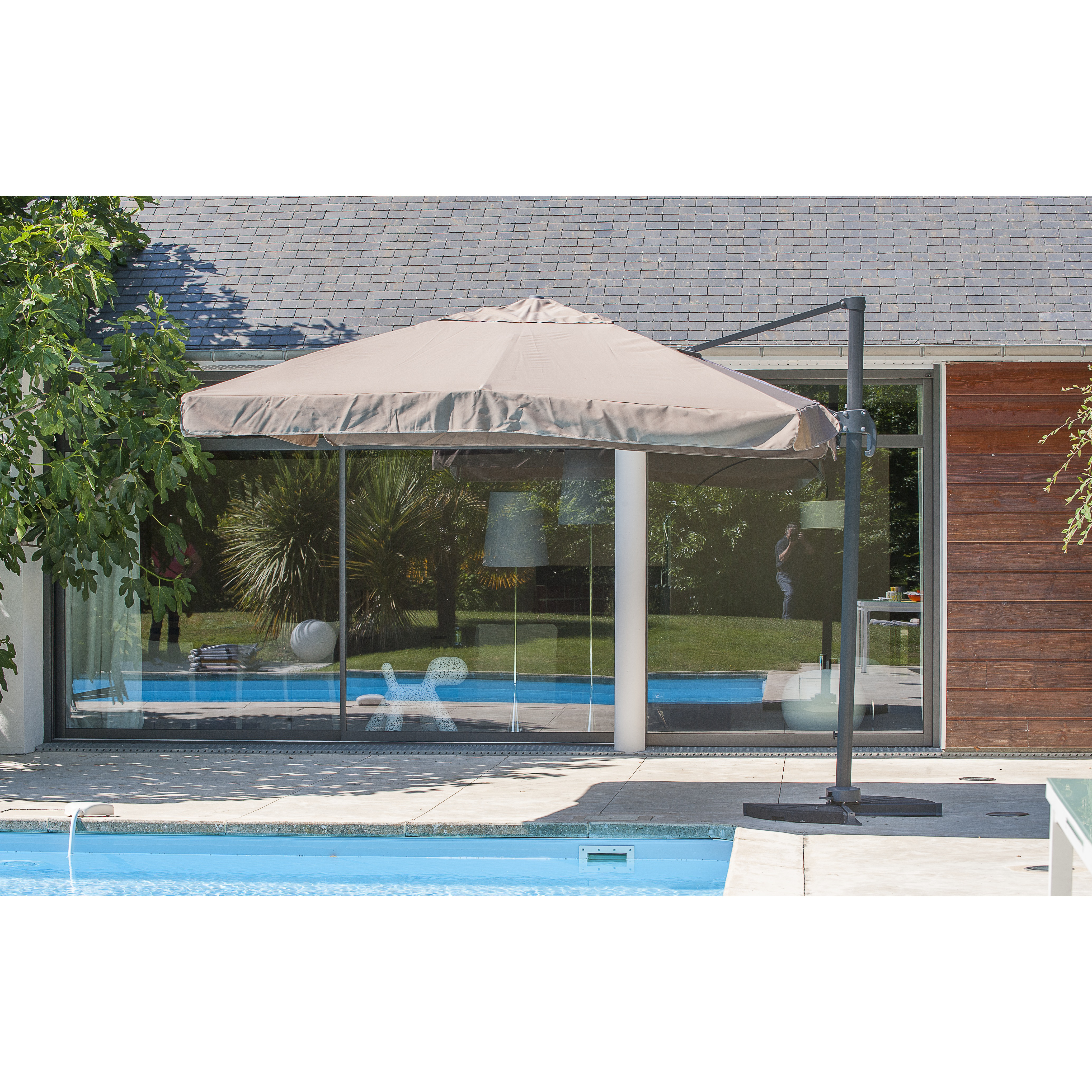 Ce parasol carré 3x3m vous protégera des rayons du soleil et se placera très facilement près de votre salon de jardin ou de votre bain de soleil grâce à son mât déporté et son pied rotatif.