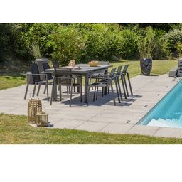 Profitez de votre jardin ou terrasse confortablement installé autour de votre salon de jardin VENISE ! Ce salon de jardin est équipé d'une table de jardin VENISE en aluminium gris anthracite. Equipée d'un plateau en céramique aspect pierre naturelle, cette table de jardin allie élégance et robustesse. Son allonge automatique de 60 cm permet en très peu de temps avec une facilité d'enfant de passer de 6 à 10 convives. A associer avec un parasol déporté pour prolonger vos journées en plein air !