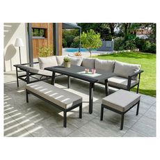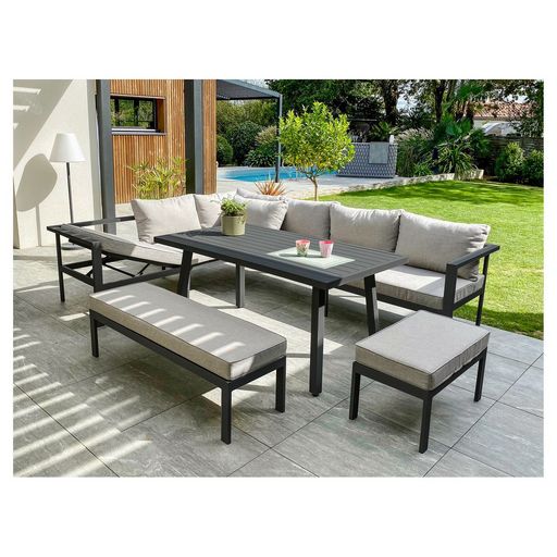 Le Salon repas de jardin 8 personnes en aluminium anthracite ANTALYA proposé par la marque DCB Garden est composé d'un canape 3 places, une table, une meridienne, un banc 2 places et un banc 1 place. Son design tendance et la souplesse de ses formes fais de ce salon une pièce elegante et chic. Les c