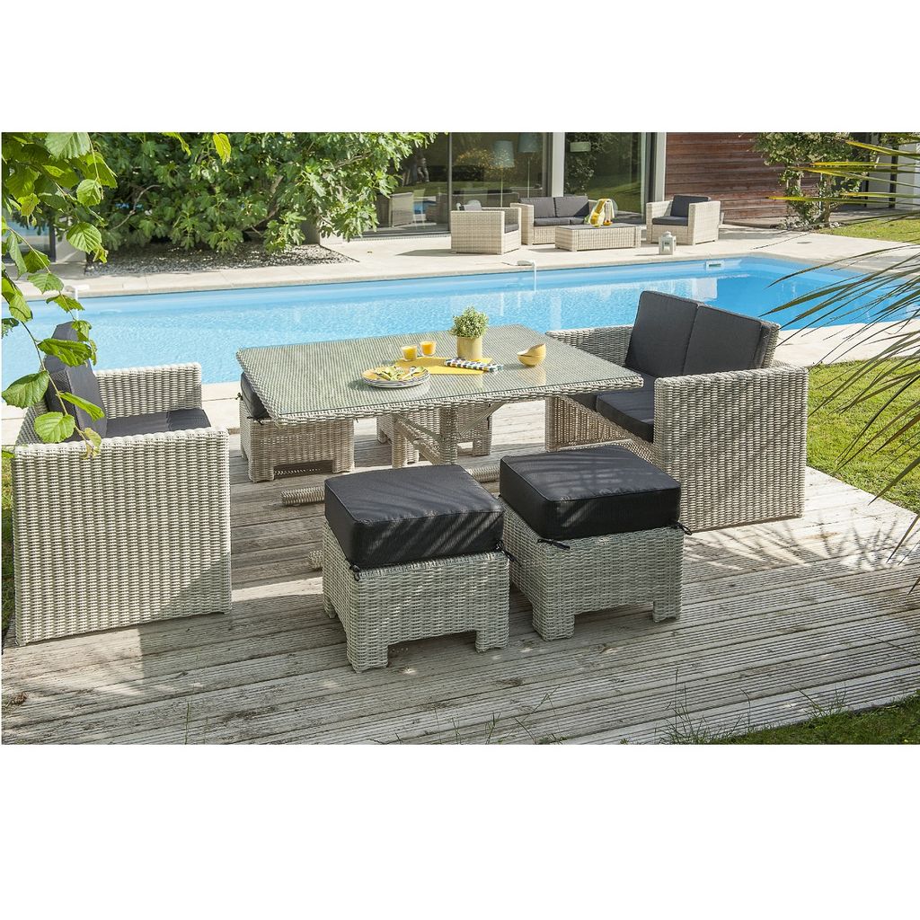 Laissez vous séduire par cet ensemble de jardin OCEANE en résine tressée de coloris crème de la marque DCB Garden ! Ce salon de jardin encastrable OCEANE est conçu pour accueillir jusqu'à 8 personnes grâce à ses 2 canapés de 2 place et ses 4 poufs. Confortable grâce à ses moelleux coussins et design, ce salon de jardin OCEANE est pratique à ranger. Sa structure en aluminium garantie sa robustesse et sa composition en résine tressée assure une bonne résistance aux intempéries ainsi qu'aux UV. A associer avec un parasol déporté de coloris beige ou gris pour prolonger vos journées au soleil !
