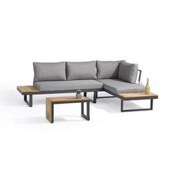 Le salon de jardin TOKYO en aluminium gris anthracite est modulable a souhait : le salon d'angle devient lit, sa table basse devient une console. Ses coussins gris clair tres épais sont la garantie d'un confort optimal. Ensemble composé de : une table basse avec plateau en bois d'acacia, 2 méridienn
