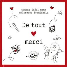 Attention ... Voici le cadeau idéal pour une maitresse formidable ! Quoi de mieux qu'un cadeau empreint de reconnaissance, de délicatesse et de gourmandise pour remercier celle qui a accompagné, guidé et encouragé votre enfant tout au long de l'année ? Le coffret Merci pour tout est conçu pour offrir un moment de plaisir et de réconfort à celles qui donnent tant au quotidien : Les maîtresses ! Composé d'une élégante et résistante tasse bi-matière en céramique de haute qualité avec l'inscription De tout merci ! et d'un livret, gourmand et pratique, comprenant 6 recettes réconfortantes(madeleines, rochers coco, cookies sticks...) à savourer et des pages de notes pour ne rien oublier, c'est LE cadeau idéal à offrir à la maîtresse, en toute simplicité, seul ou en complément d'un mot doux ou d'un joli dessin. Parce que dire merci avec le coeur, c'est offrir un peu de douceur !