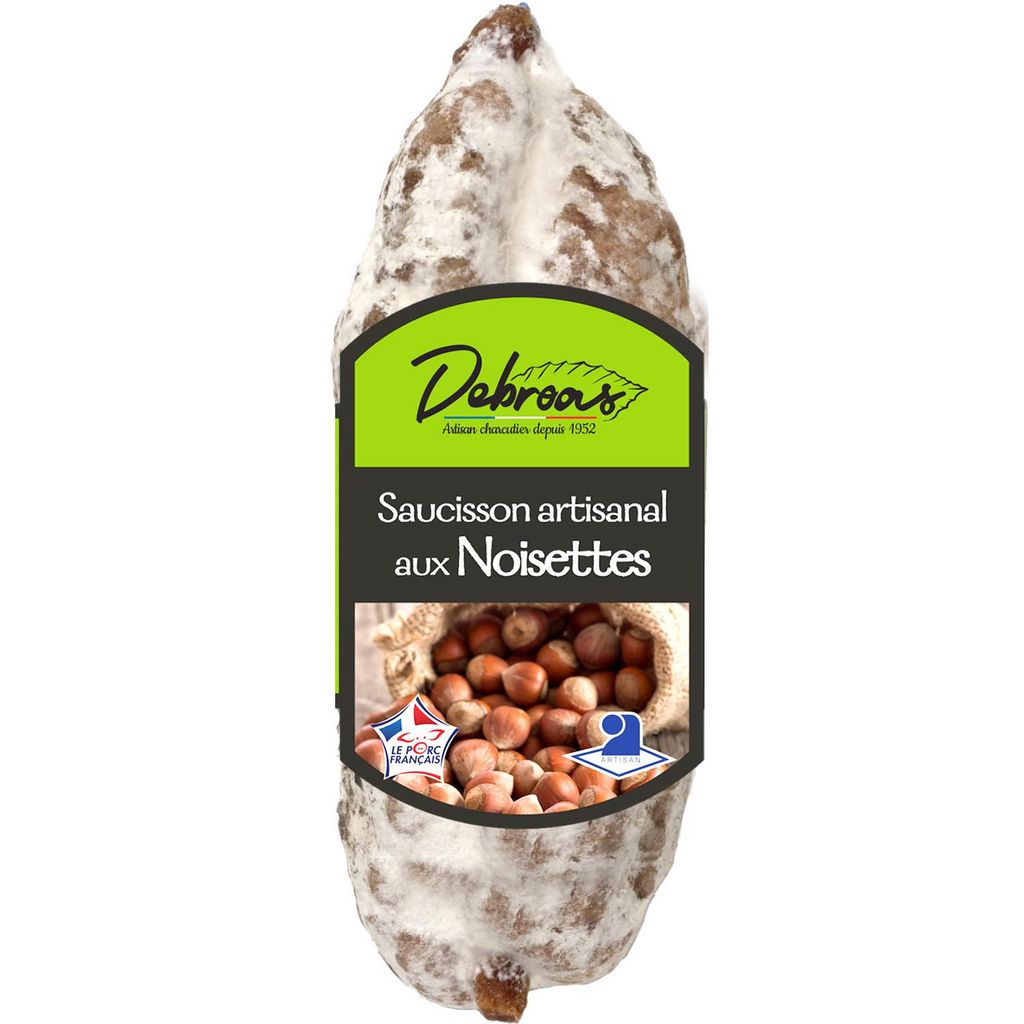 viande de porc, NOISETTES 4.5%, sel, LACTOSE, vin, dextrose, épices et plantes aromatiques, nitrate de potassium, FERMENTS LACTIQUES, boyau naturel de porc.
