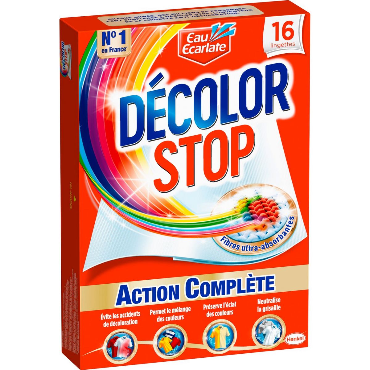 Decolor Stop Action Complète, notre meilleure lingette anti-décoloration assure une protection optimale de vos vêtements, non seulement des couleurs dégorgées mais également des résidus qui ternissent les couleurs de votre linge. La lingette est composée de fibres ultra absorbantes capables d’éviter les accidents de decoloration, préserver l‘éclat des couleurs, neutraliser la grisaille et vous permettent de laver toutes vos couleurs ensemble. La preuve est sur la lingette ! Toujours se reporter aux instructions de votre fabricant de machine à laver. Tenir hors de portée des enfants. Décolor Stop Action complète x16 lingettes