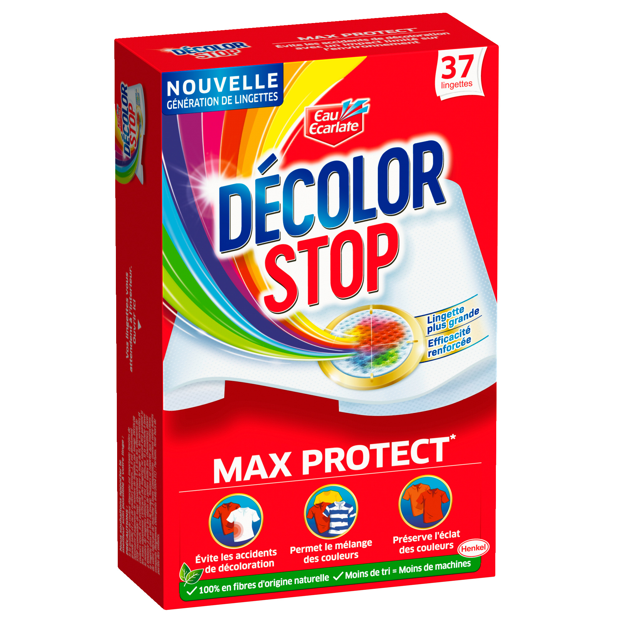 Avec Décolor Stop Max Protect, évitez les accidents de décolorations grâce à sa lingette aux fibres ultra-absorbantes certifiée FSC. Nos lingettes vous permettent de mélanger les couleurs dans vos machines et de préserver l’éclat des couleurs. Elles empêchent également les résidus de se déposer sur vos vêtements. La preuve est sur la lingette !