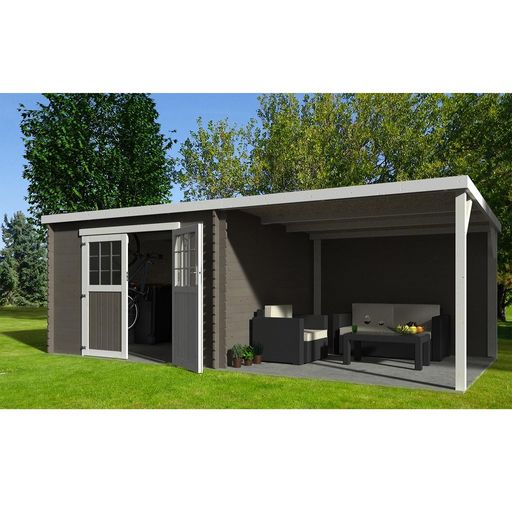 Abri en madriers massifs de 28mm avec un auvent couvert inclus.