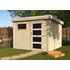 Abri de jardin en bois mono-pente vers l'arrière, avec 1 porte simple et 1 fenêtre fixe.