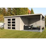 Cet abri de jardin Délices, dont la surface hors tout est de 19,11 m², est constitué d'un abri fermé et d'un auvent. La partie abri a une superficie de 8,65 m² et dispose d'un passage de porte sans seuil. La partie auvent a une superficie de 7,84 m² que l'on peut considérer comme une terrasse couverte ou carport pour petite voiture (hauteur de faitage de 2m). Il est idéal pour stocker votre matériel de jardin et votre mobilier de jardin tout en ayant une terrasse couverte.