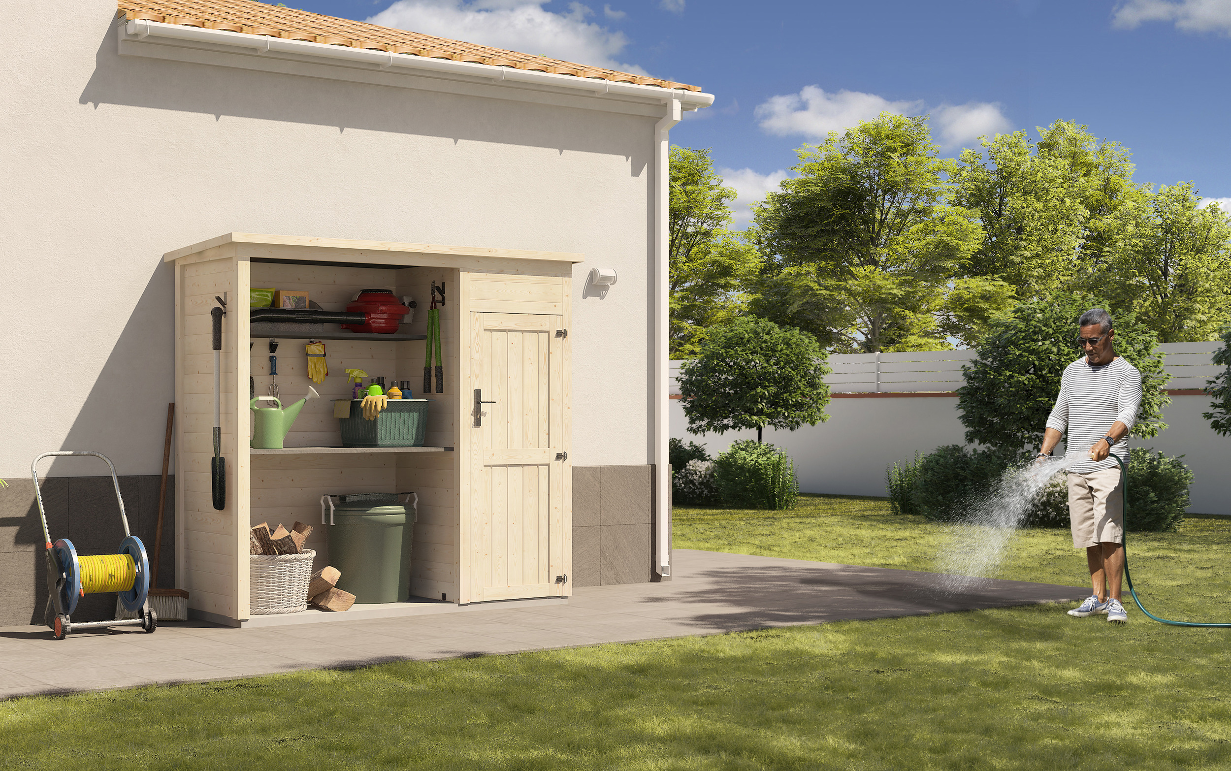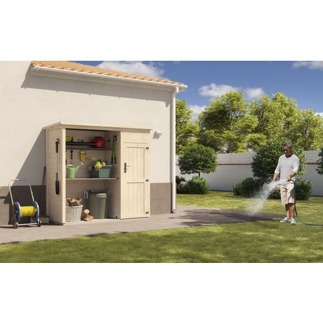 En savoir +Abri Bruna en Sapin du Nord, constitué de profils de 19mm à visser sur des poteaux d'angle, avec 2 étagères et armoire fermée. Toiture mono-pente vers l'arrière.