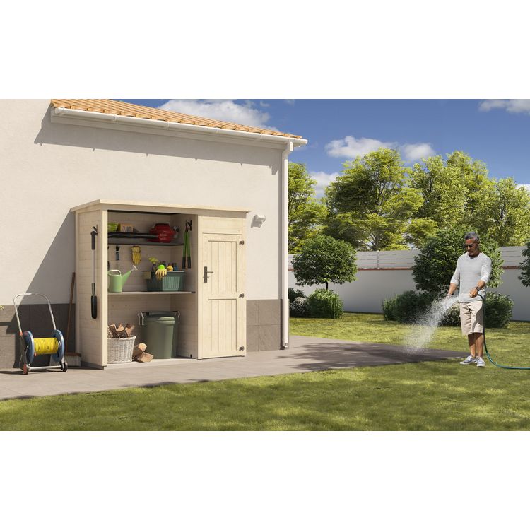 Abri Bruna en Sapin du Nord, constitué de profils de 19mm à visser sur des poteaux d'angle, avec 2 étagères et armoire fermée. Toiture mono-pente vers l'arrière.