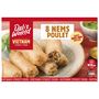 Ingrédients : Nems au poulet (25gx8): eau, farine de riz 15%, vermicelle de pois réhydraté, oignon, viande de poulet (origine : UE) 13%, carotte, protéine de SOJA réhydratée, peau de poulet rotie et gras (peau de poulet, miel) 2,3%, fécule de manioc, sel, champignon noir réhydraté, sauce POISSON (POISSON, sel, sucre), huile de tournesol, poivre.