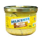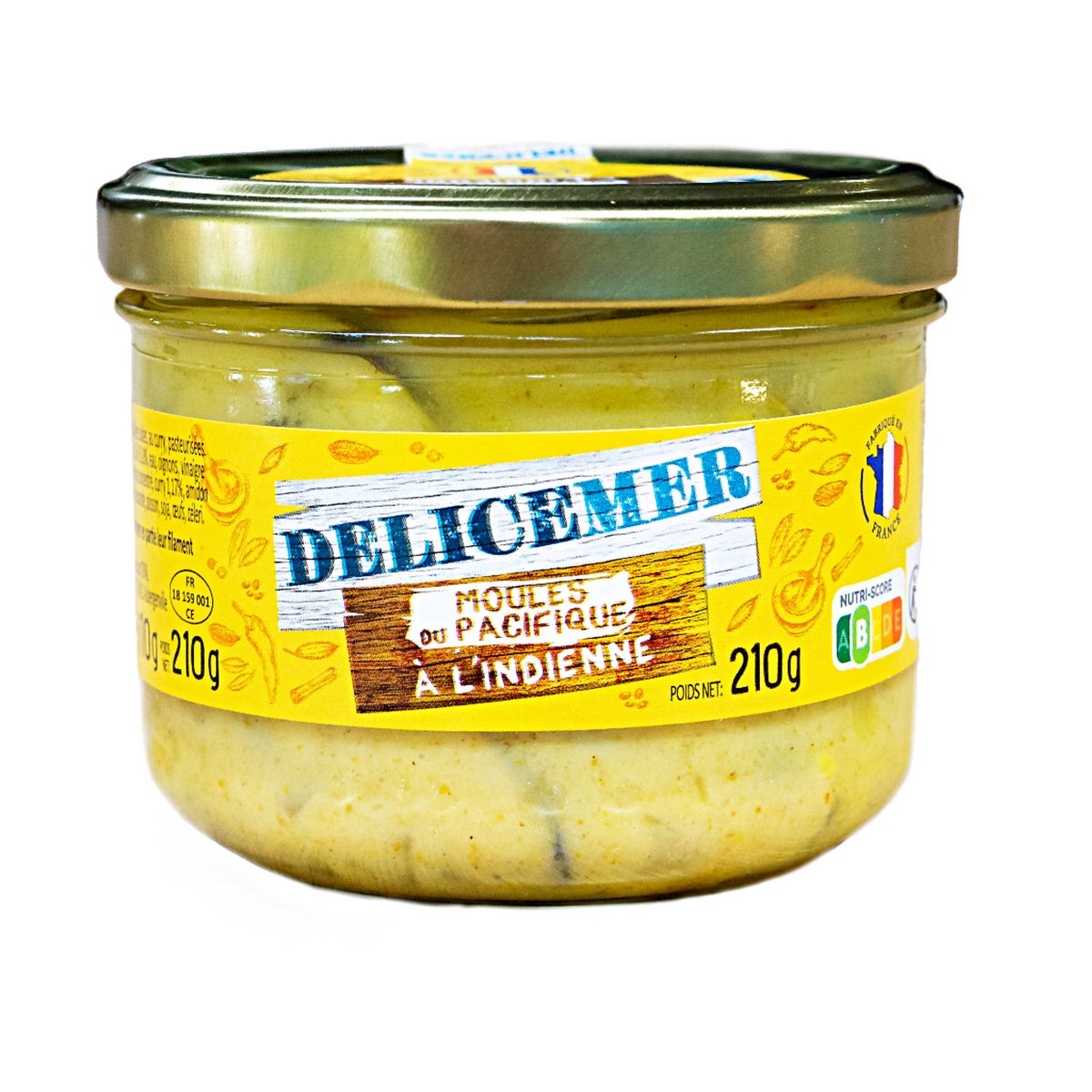 Moules du pacifique (Mytilus chilensis élevées au Chili) élevées au Chili) 51,8%, eau, oignons, vinaigre d'alcool, crème (LAIT), stabilisant : carraghénanes, sucre, jus de citron concentré, curry 1.17%, amidon modifié de manioc, sel, acidifiant : E330