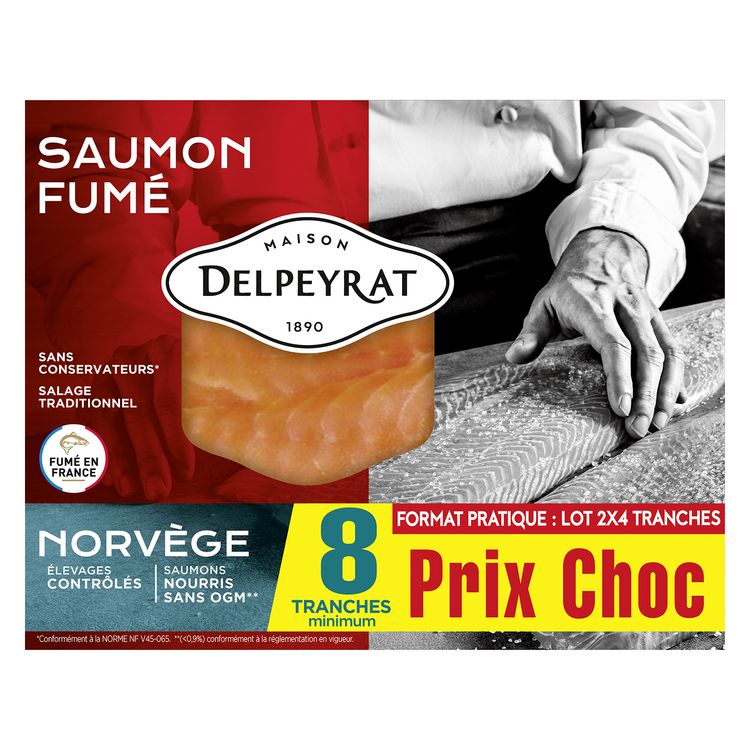 Le Saumon Fumé Delpeyrat origine Norvège 8 Tranches mini Lot de 2X4 Tranches de saumon fumé au bois de chêne et salé au sel sec . Transformé en France