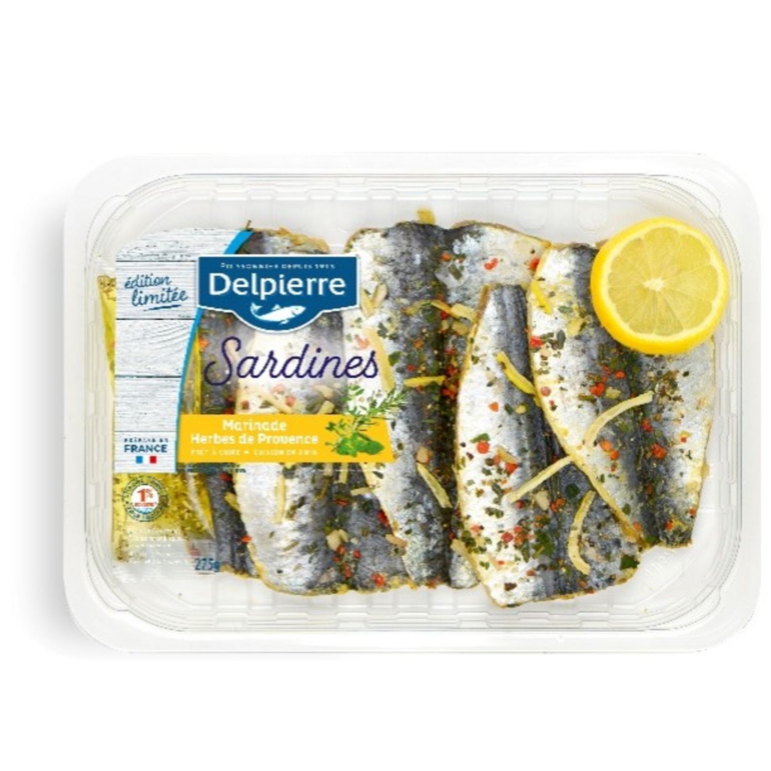 Sardines salées avec décor 92,9% : Sardines salées 96,1% (sardines - Sardina pilchardus - pêchées en Atlantique Centre Est, eau, sel, conservateurs : E326, E261, E202, acidifiant : acide citrique), rondelle de citron 2,7%, zestes de citron 0.4%, mélange d'herbes de Provence (basilic, origan, romarin, thym) 0,4%, épices, marinade 7,1% (Huile de colza, Huile d’olive vierge extra, Arôme naturel de citron 1%, Herbes de Provence 1%).