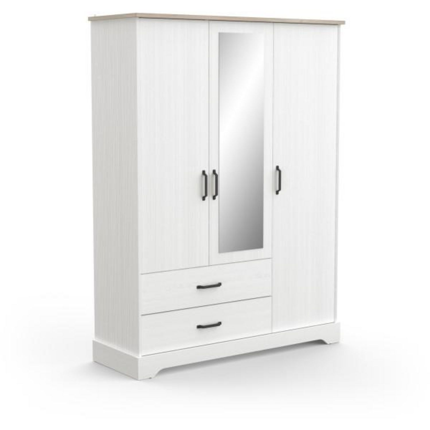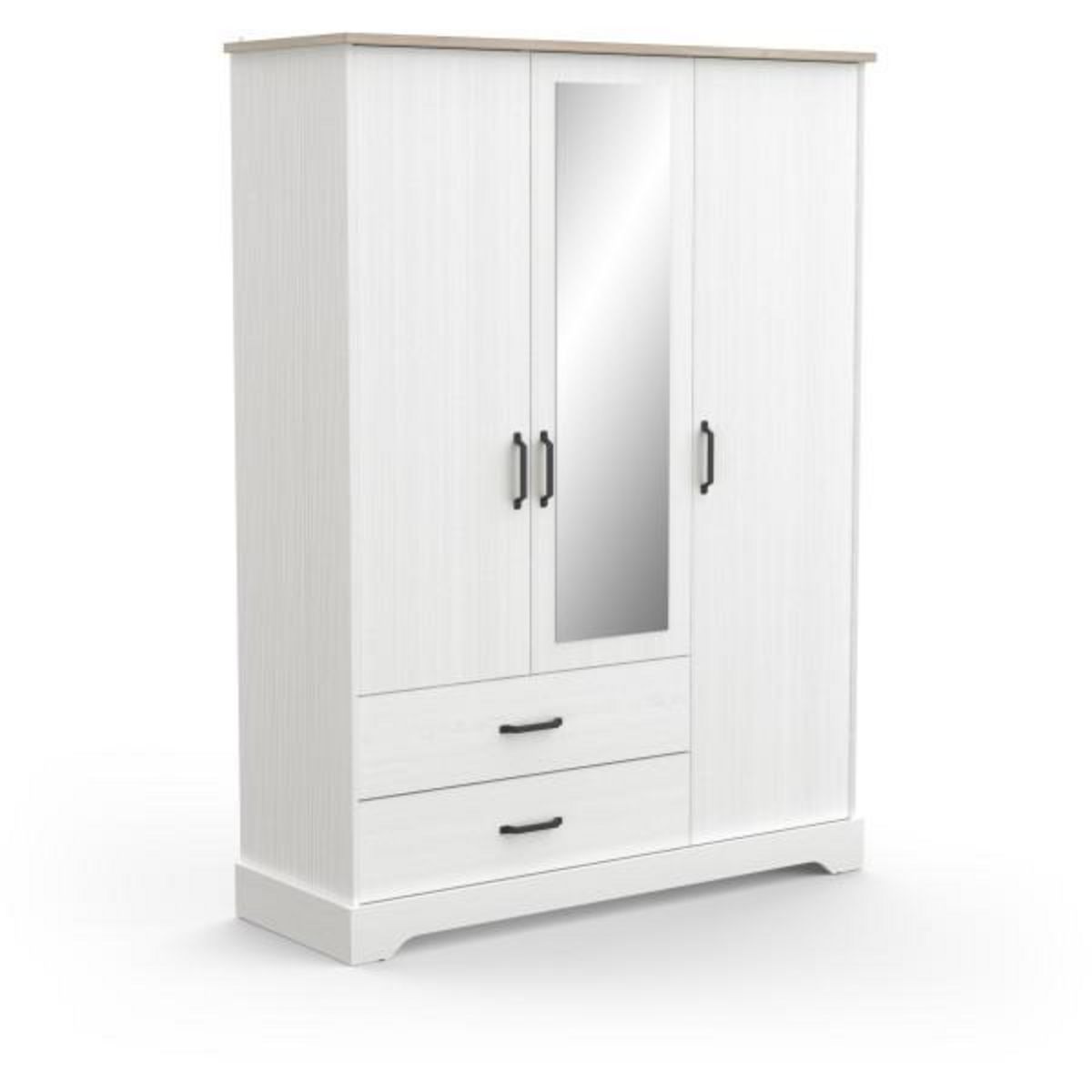 En savoir +Apportez une touche d'élégance rustique a votre chambre avec l'armoire COTTAGE. Conçue en mélamine blanche structurée et décor chene Kronberg, elle offre une finition soignée avec chants ABS épais. Dotée de 3 portes dont une avec miroir, 2 tiroirs spacieux et un intérieur bien pensé (2/3 penderie, 1/3 lingere), elle allie fonctionnalité et charme. Les poignées imitation métal gris antique et les pieds a découpe originale ajoutent du caractere. Fabrication robuste avec panneaux de particules de 15 mm et charnieres métalliques. Un meuble complet pour une chambre organisée et stylée.