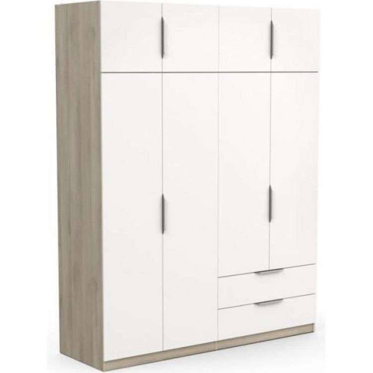 L'armoire GHOST de la marque DEMEYERE est un meuble de chambre contemporain de dimensions L.157,3 x P.51,1 x H.203 cm. Elle est équipée de 8 portes battantes, de 2 tiroirs de rangement et de 3 étageres. Sa structure en panneaux de particules mélaminés blanc mat et décor chene lui confere un style mo