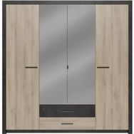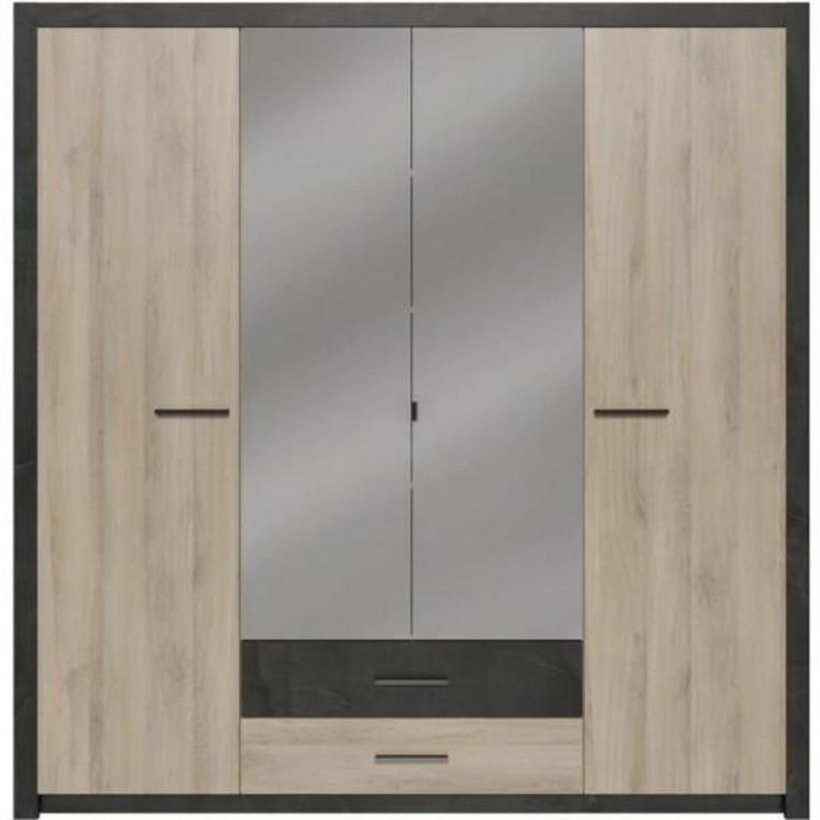 COLORADO Armoire 4 PO / 2 T Chene Kronberg / Sidewalk de dimesions L 198 x H 203,1 x 56,6 cm. Epaisseur 15 mm. Montants MDF enrobé. 2 miroirs a bords rodés 3 mm / H 1519 mm x L 419 mm. Coulisses a bille métal 17 mm. Chants droits. Charniere métal D 26 mm. Tiroir hauteur de 120 mm. Raidisseur métal d