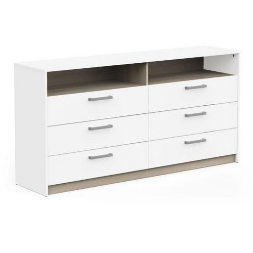 Craquez pour la commode WATSON au look moderne et épuré. Son mélange de blanc mat et chene Kronberg crée une ambiance douce et contemporaine. Dotée de 6 tiroirs spacieux et d'une niche centrale, elle est idéale pour organiser votre linge et vos objets du quotidien. Robuste, elle supporte jusqu'a 27