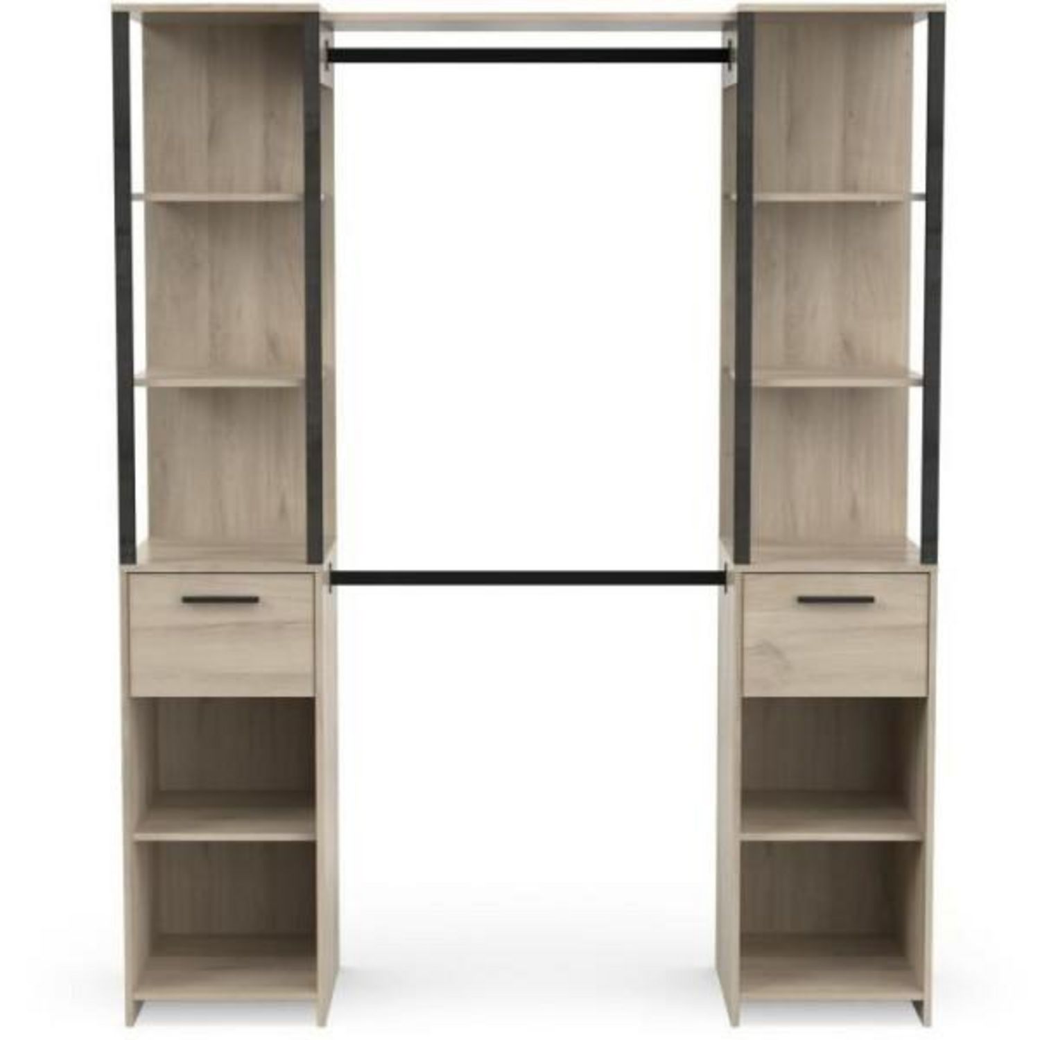 Optez pour l'élégance et la fonctionnalité avec le kit dressing GARY. Son style industriel tres tendance et son ton bi-couleur Chene Kronberg/Noir Mat apportent une touche moderne a votre espace. Avec ses rangements malins, 2 colonnes et 2 tiroirs montés sur coulisses a billes, chaque colonne compre