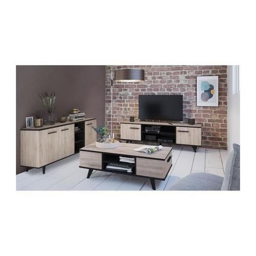 Ensemble meuble TV table basse buffet WAYNE - Mélaminé - Style scandinave - Chene brossé et noir