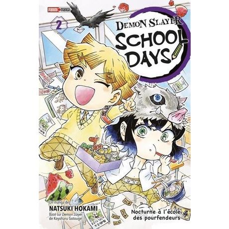 Bienvenue à l'école des pourfendeurs de démons ! Dans ce spin-off, tous les personnages de la série sont devenus des professeurs ou des élèves au sein du groupe scolaire des pourfendeurs (primaire, collège et lycée). L'apparition inopinée d'un chat va venir perturber les cours tandis qu'un vent de panique soufflera aux sources thermales... Et, pour ne rien gâcher, un fantôme fera même son apparition lors d'une séance de révision collective pour les examens ! Après avoir conquis tant de lecteurs avec Demon Slayer, la série de Koyoharu Gotouge se tourne maintenant vers l'humour. Demon Slayer School Days, dessiné par Natsuki Hokami, est le manga dérivé du court anime parodique du même nom. Cette fois, il n'est pas question pour nos pourfendeurs de se lancer dans des confrontations grandioses face à d'impressionnants démons. Tanjirô et ses amis rejoignent les bancs de l'école en tant qu'étudiants. Une nouvelle facette où l'action laisse place aux fous rires. Un spin-off toujours en cours au Japon et qui devrait autant plaire aux fans de la licence qu'à ceux désirant une aventure particulièrement drôle.