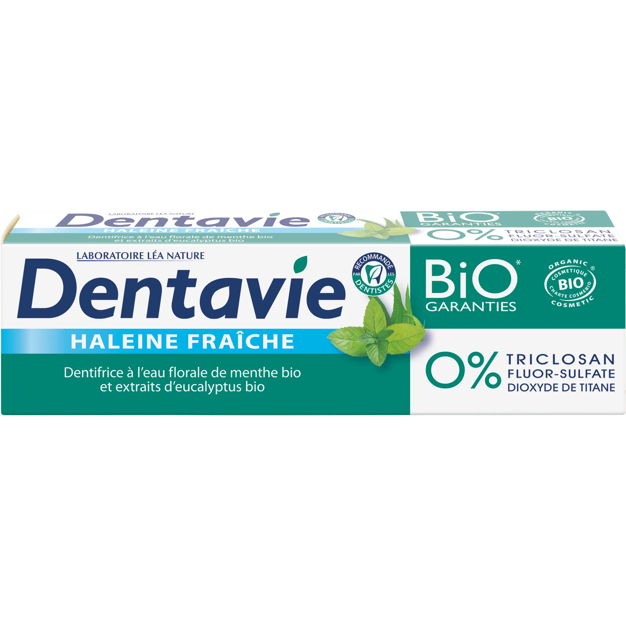 Dentifrice Blancheur et haleine fraiche, menthe et eucalyptus bio Dentifrice Haleine Fraiche à l'eau florale de menthe bio et extraits d'eucalyptus bio est un dentifrice sans ingrédients superflus et controversés (sans colorant, aluminium, sulfates, triclosan, dioxyde de titane, fluor). Il convient aux vegans