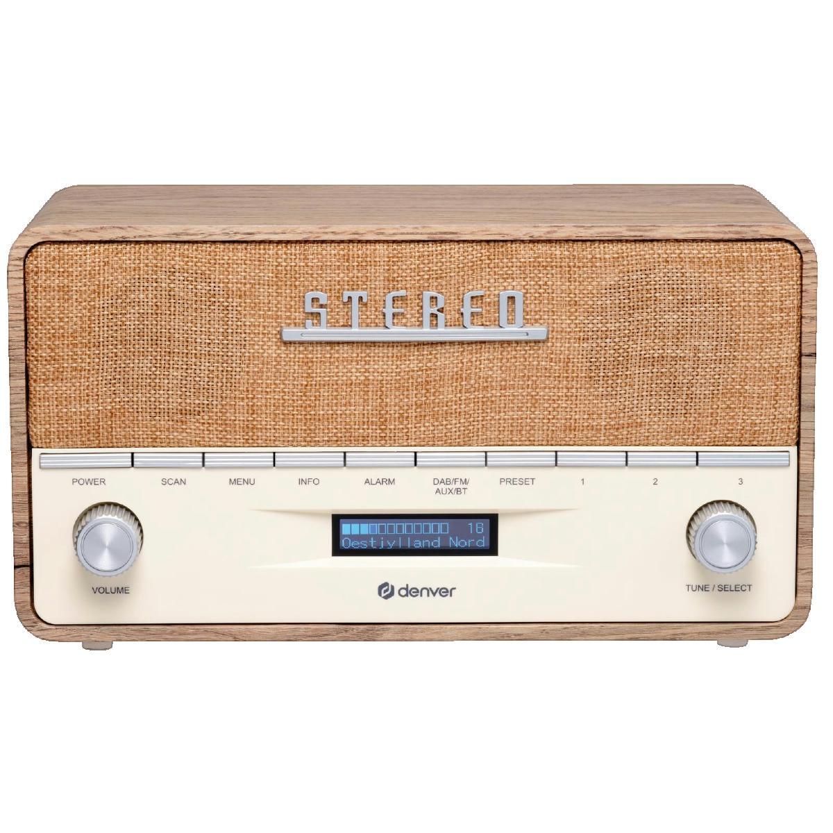 Découvrez la radio portable Denver Electronics DAB-36LW, un appareil compact et élégant avec un design rétro en boîtier bois brun et blanc. Elle offre une réception numérique de haute qualité grâce à son tuner DAB+/FM, permettant d'accéder à une large gamme de stations radio. Dotée d'un écran LCD ré