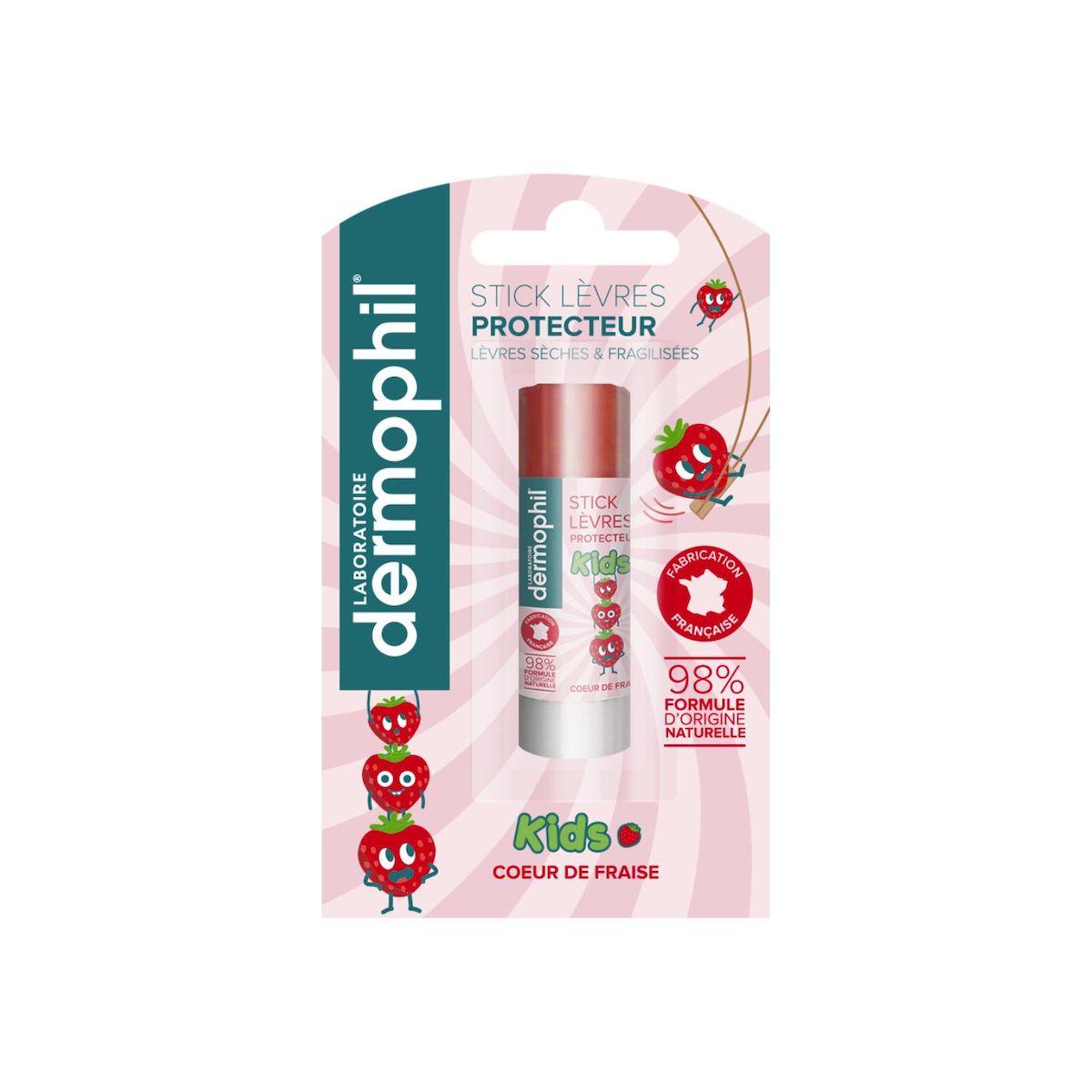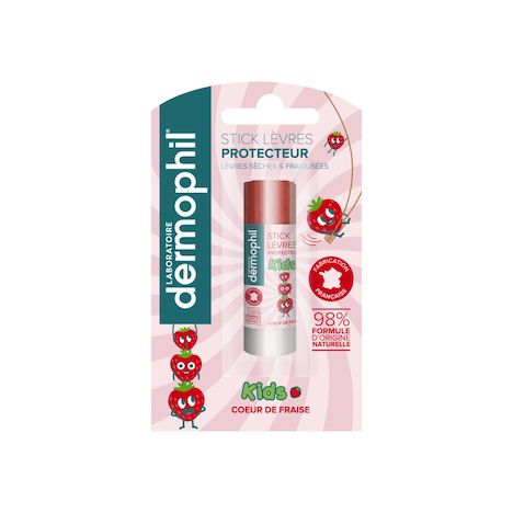 Dermophil innove avec le Stick Lèvres Kids Fraise, ingrédients d'origine naturelle.